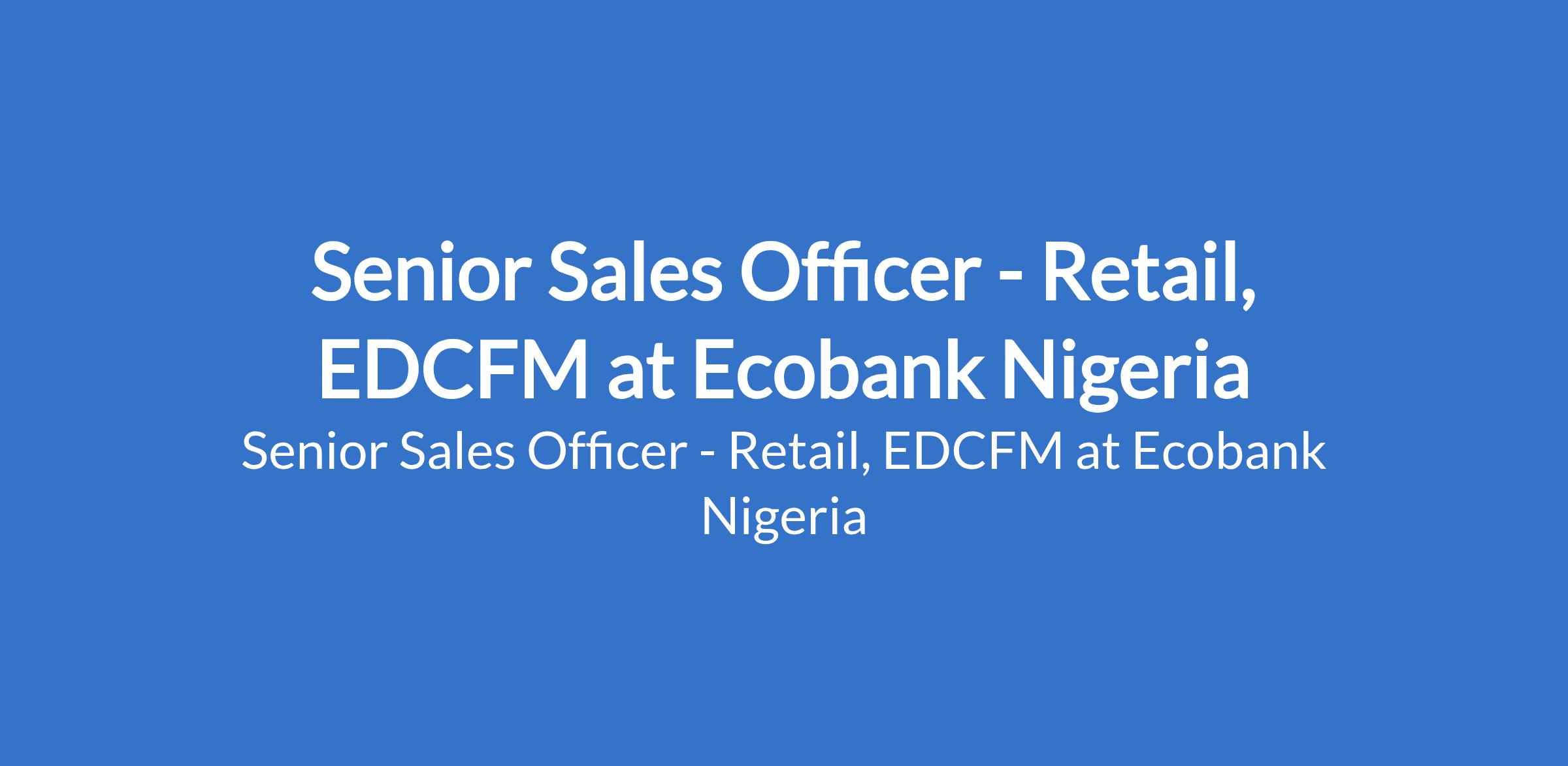 Ecobank Nigeria is recruiting to fill the position of: Senior Sales Officer - Retail, EDCFM. The position is located in Victoria Island, Lagos State. Interested candidates should possess a Bachelor's or Masters Degree with 4 - 7 years sales/marketing experience with good sales track record, in selling investment products.
