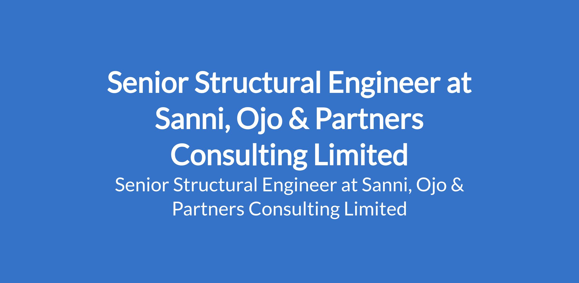 Sanni, Ojo & Partners Consulting Limited is recruiting to fill the position of: Senior Structural Engineer. The position is located in Shomolu, Lagos State. Salary: N400,000 - N500,000 per month. Interested candidates should possess a B.Eng. / B.Sc Degree in Civil Engineering; MNSE, MNISTRUCTE; COREN registration is mandatory with a minimum of 5 years post-graduation experience.