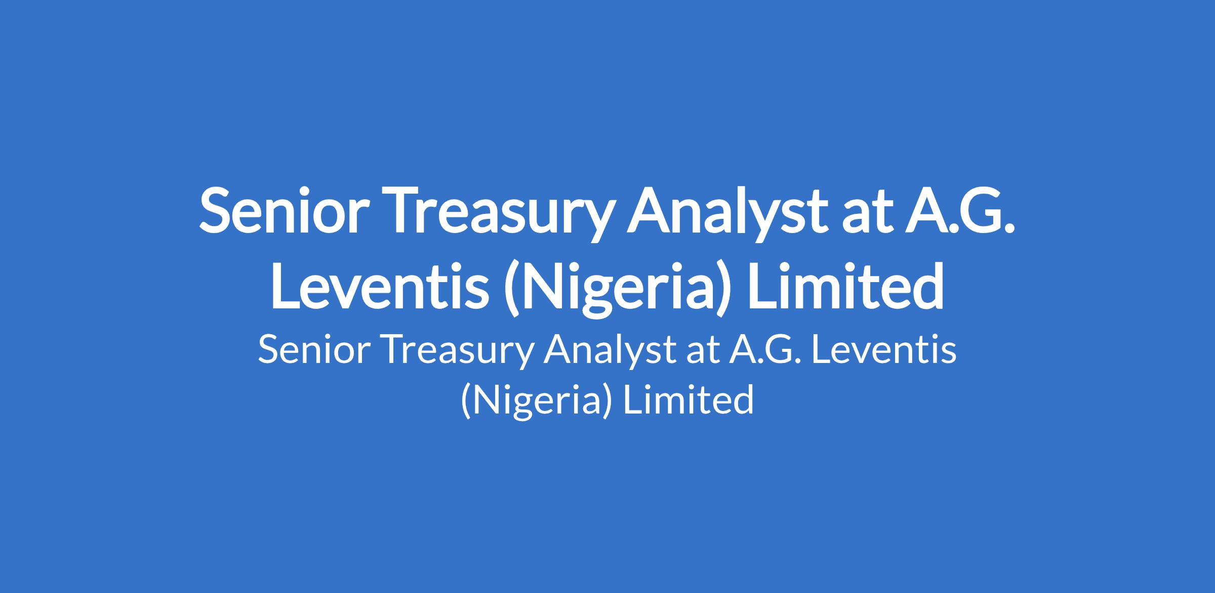A.G. Leventis (Nigeria) Limited is recruiting to fill the position of: Senior Treasury Analyst. The position is located in Lagos State. Interested candidates should possess an HND / BSc in Finance, Accounting, or a related field with 3-5 years of experience in a treasury and banking environment.