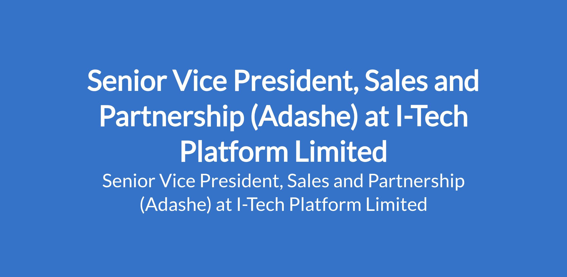 I-Tech Platform Limited is recruiting to fill the position of: Senior Vice President, Sales and Partnership (Adashe). The position is located in Abuja (FCT). Interested candidates should possess a Bachelors Degree in Business, Economics, Finance, Marketing, or a related field (MBA is an advantage) with 7 10 years of experience in business development, growth, fintech, banking, cooperative management, or digital platforms.