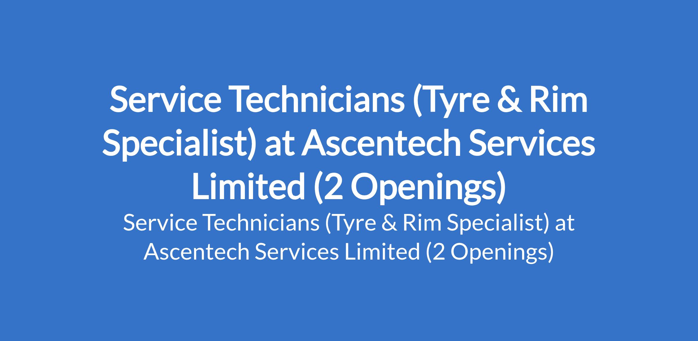 Ascentech Services Limited is recruiting to fill the position of: Service Technician (Tyre & Rim Specialist). The position is located in Lekki, and Ilupeju - Lagos State. Salary: N100,000 - N125,000 monthly. Interested candidates should possess minimum of an SSCE / OND qualification with 1 - 3 years experience in tyre service or related role.