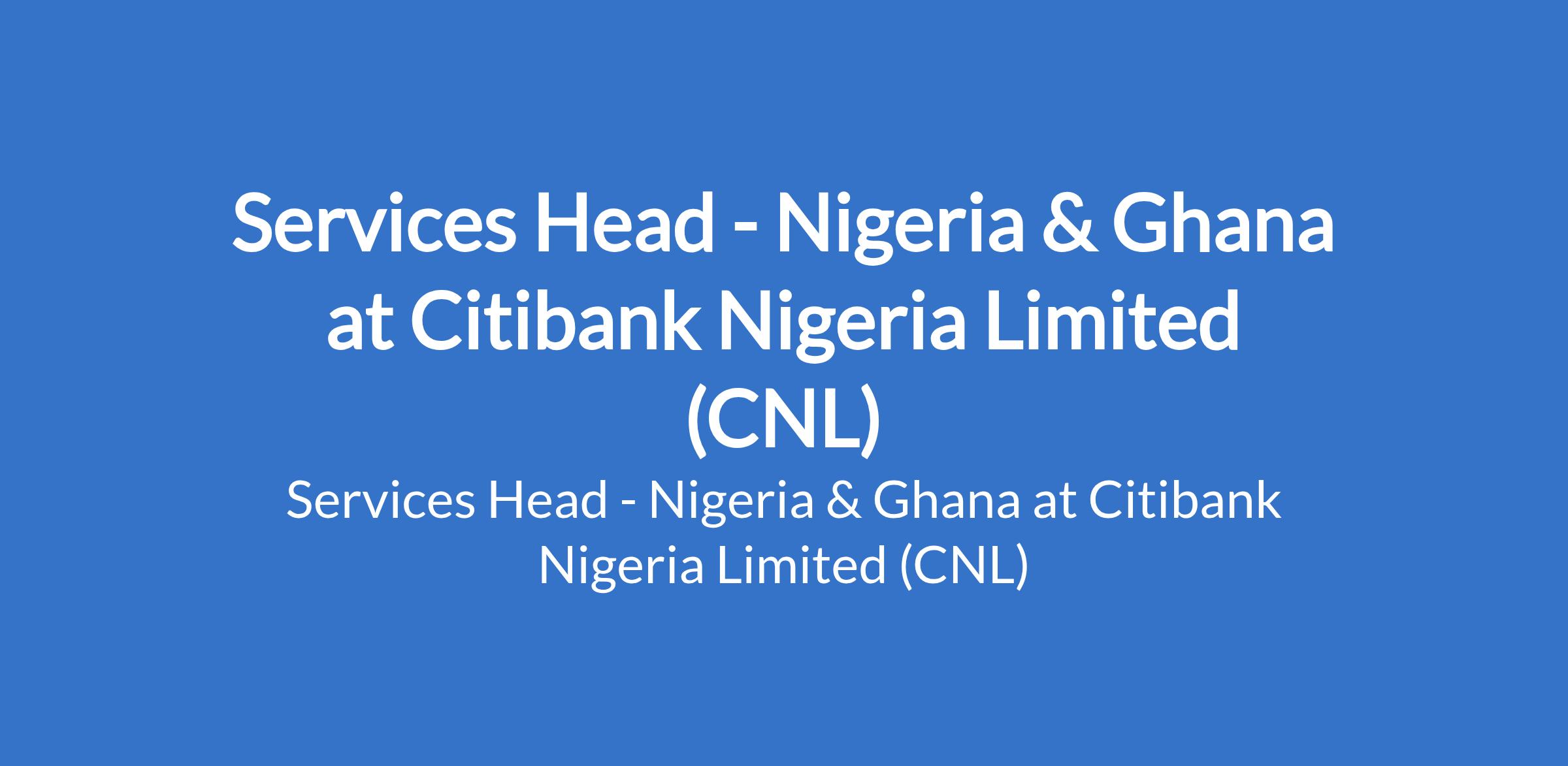 Citibank Nigeria Limited (CNL) is recruiting to fill the position of: Services Head - Nigeria & Ghana. The position is located in Lagos State. Interested candidates should possess a minimum of1st Degree or equivalent in any discipline, plus a relevant higher Degree or professional qualification with a minimum of 15 years post-graduation experience, out of which at least 12 must have been in the banking industry and at least 2 as VP/Deputy General Manager.