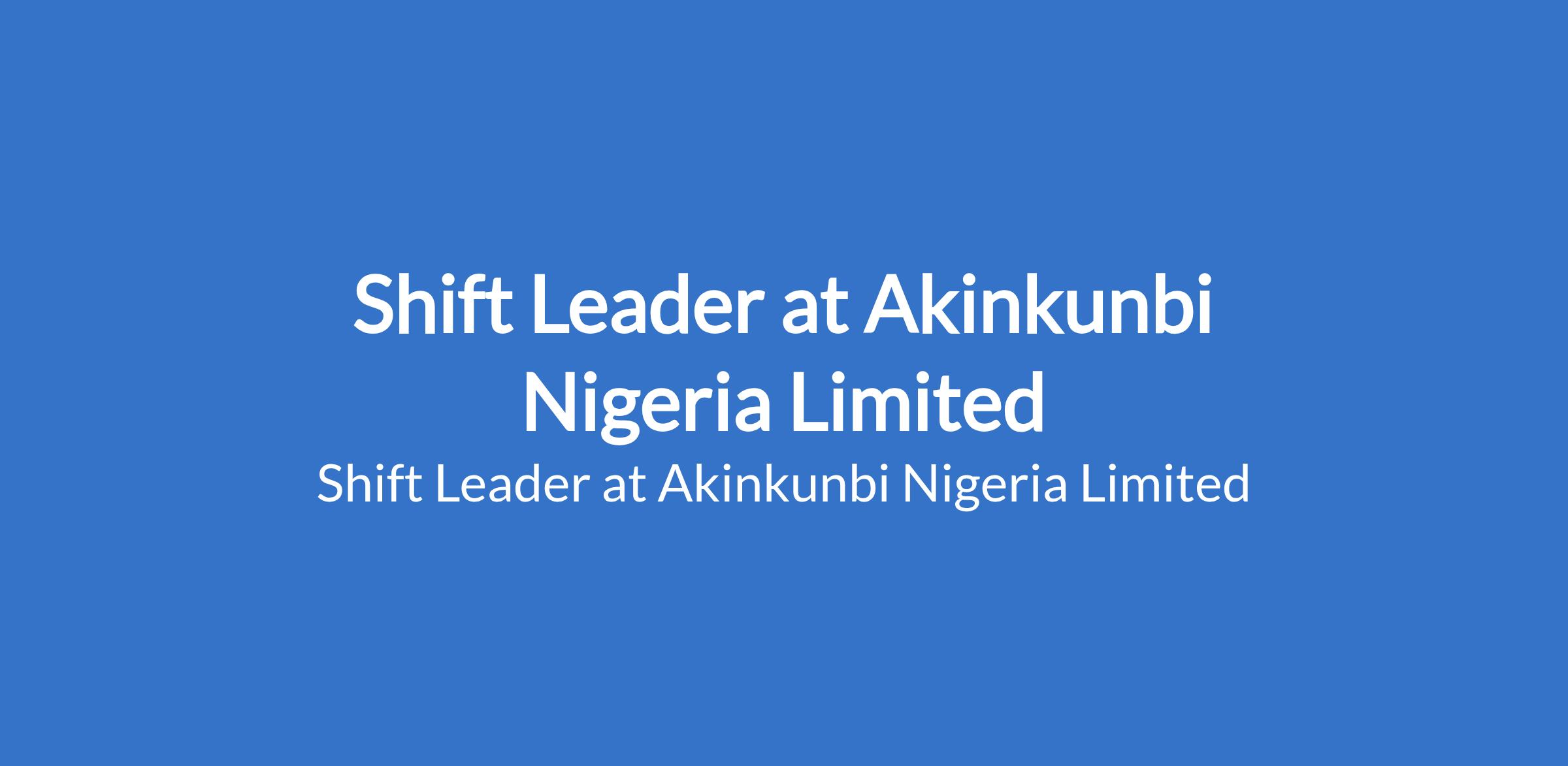 Akinkunbi Nigeria Limited is recruiting to fill the position of: Shift Leader. The position is located in Ikeja, Lagos State. Salary: N150,000 - N200,000 monthly. Interested candidates should possess an OND / HND qualification with 2 years experience