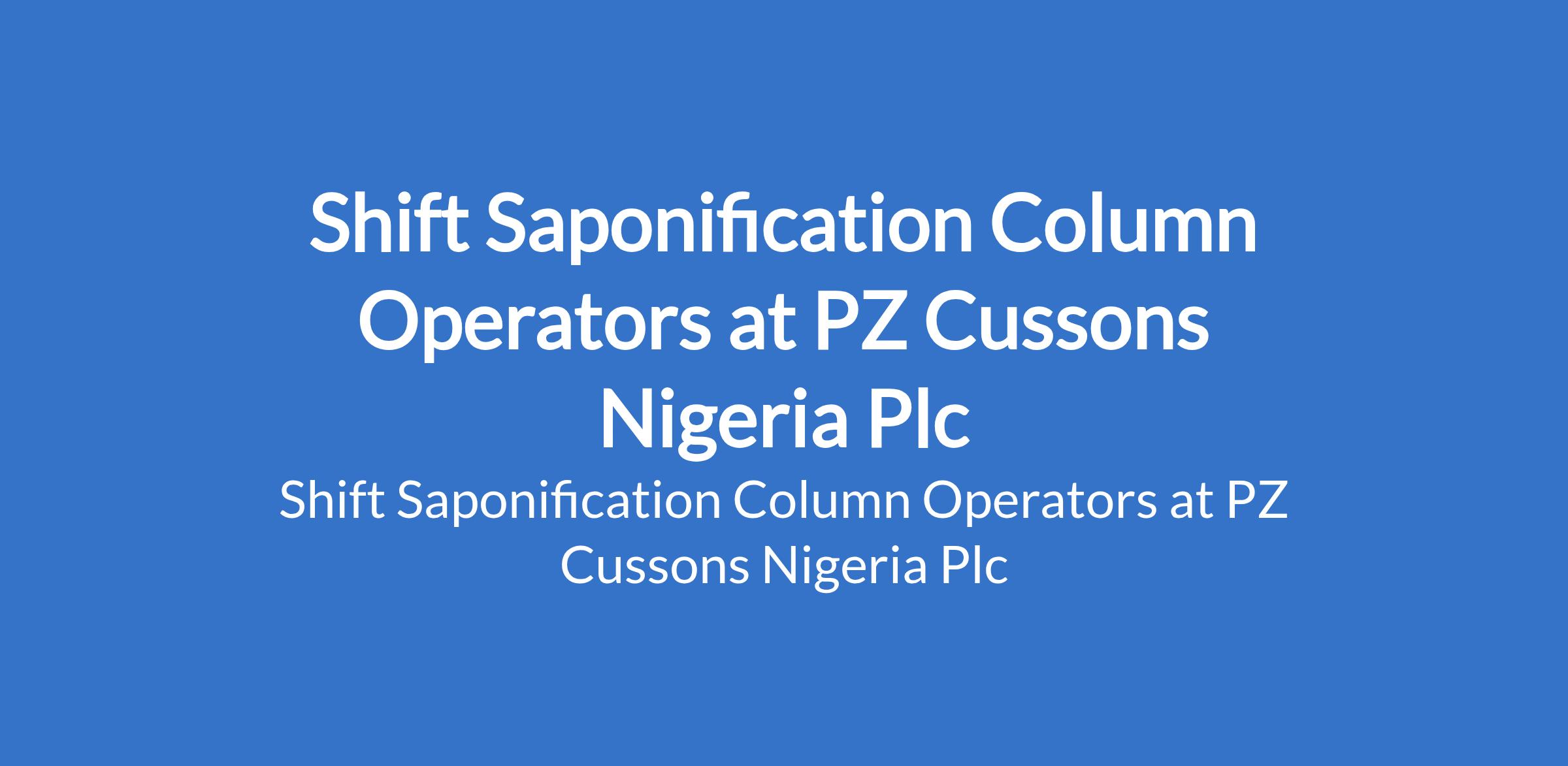 PZ Cussons Nigeria Plc is recruiting to fill the position of: Shift Saponification Column Operator. The position is located in Aba, Abia State. Interested candidates should possess an SSCE / NABTEB / OND /HND qualification with 1-3 years work experience in a similar position.