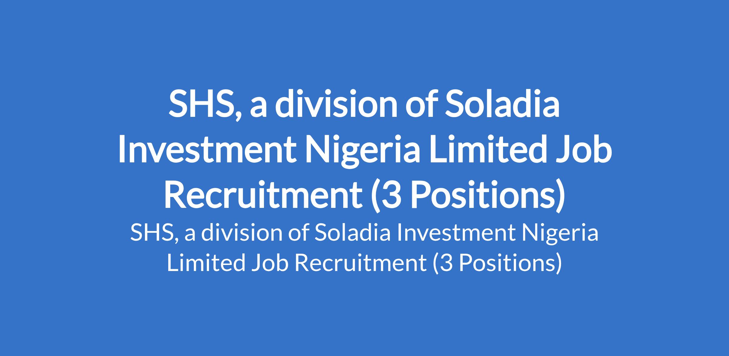 SHS, a division of Soladia Investment Nigeria Limited Job Recruitment (3 Positions)