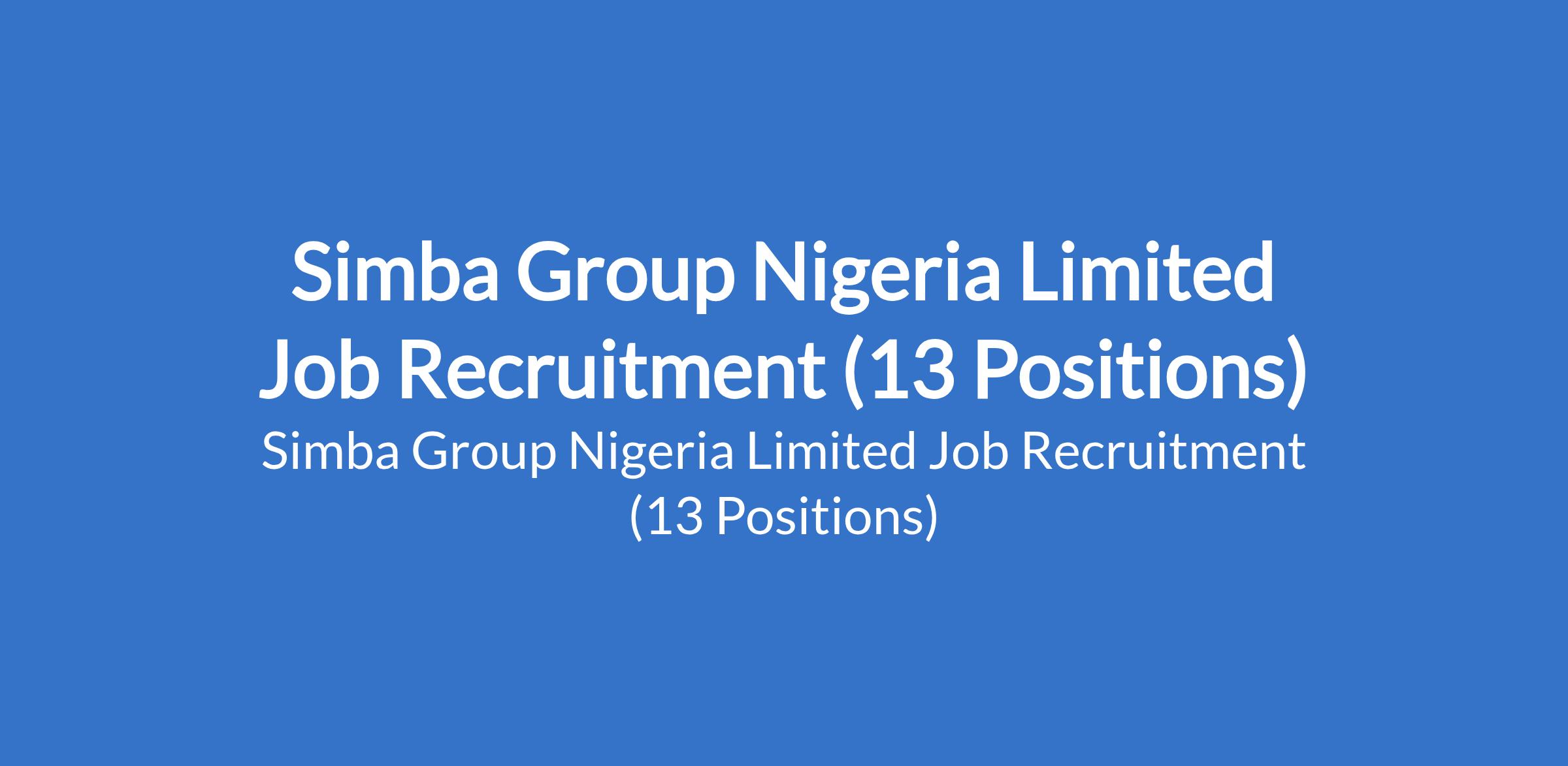 Simba Group Nigeria Limited is recruiting suitably qualified candidates to fill the following positions in Abuja (FCT), Kano, Enugu, Oyo, Rivers and Lagos States: Automotive Engine Technician; Brand Executive; Accountant; Sales Team Lead (Automobile); Senior Sales Executive; Institution / Government Sales Manager; Solar Channel Sales Manager; Solar Sales Manager; Retail Sales Executive; Sales Coordinator / Analyst; Regional Marketing Executive Automobile; and Sales Team Lead.