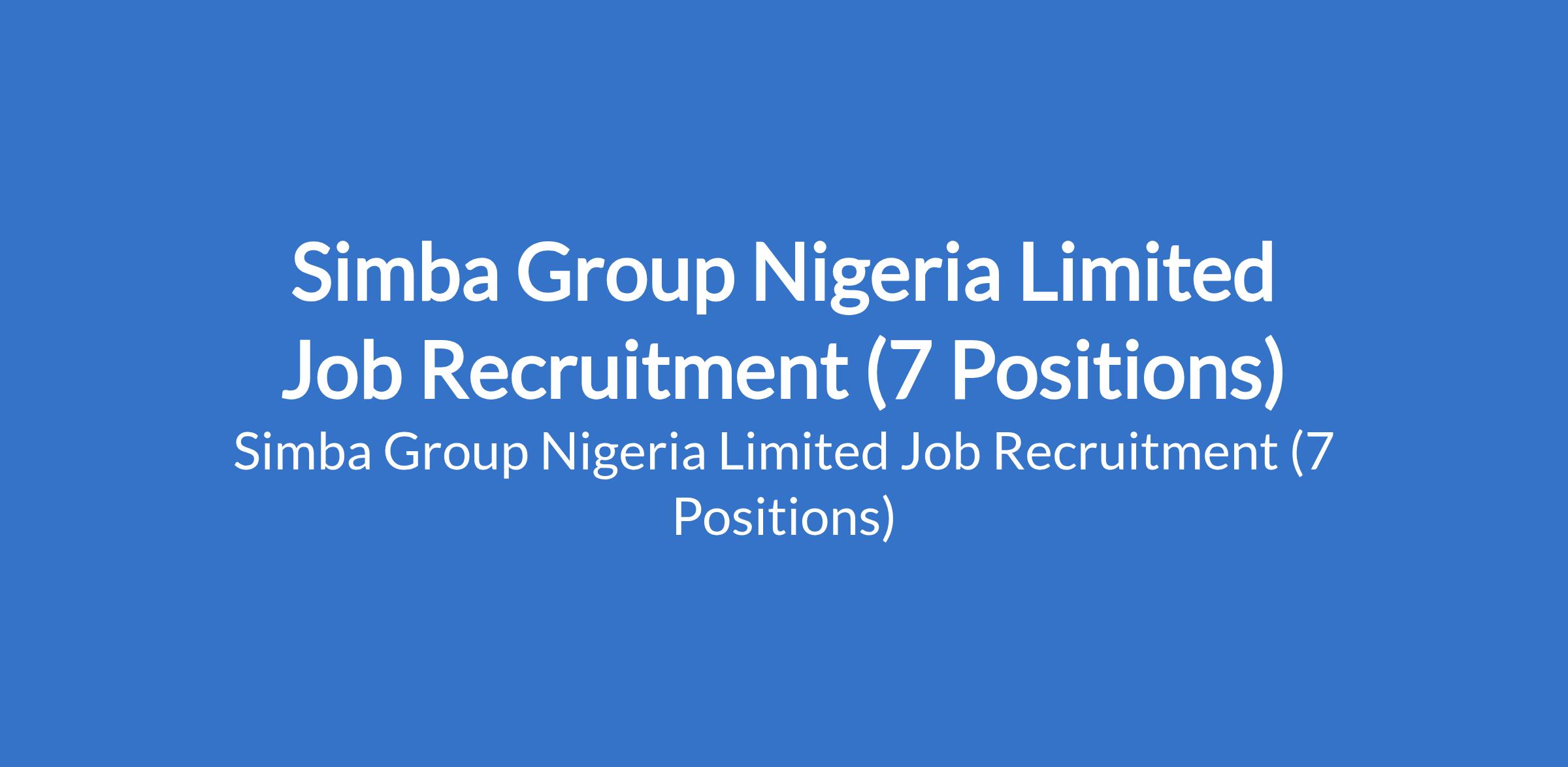 Simba Group Nigeria Limited is recruiting suitably qualified candidates to fill the following positions in Kano, Lagos and Rivers States: Solar Design Engineer, Customer Support Intern (SIWES / IT), Telesales Supervisor, Merchandiser, Fabrication Manager (3 Wheeler Automobile), Solar Sales Manager, and Accountant.