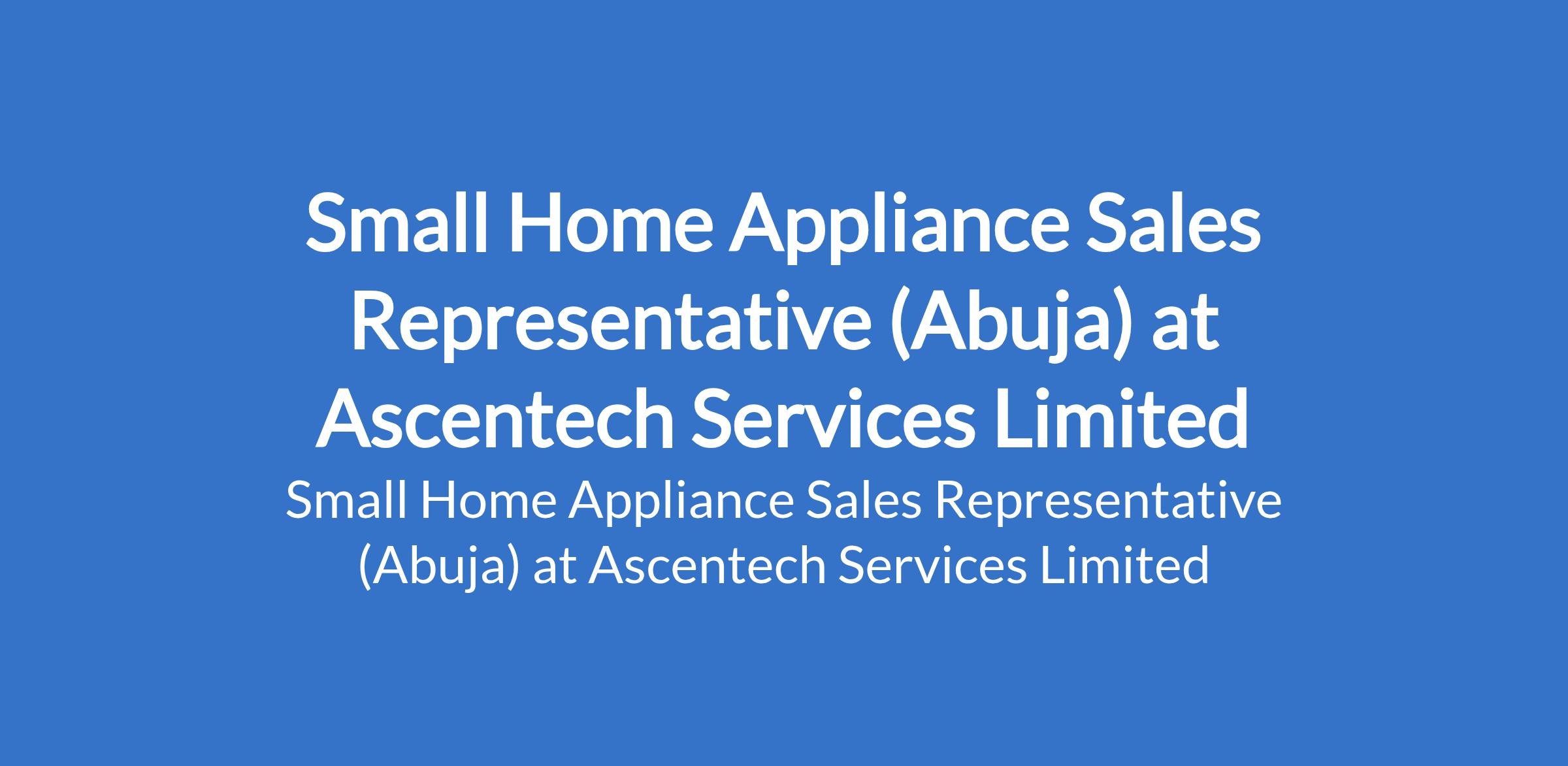 Ascentech Services Limited is recruiting to fill the position of: Small Home Appliance Sales Representative. The position is located in Abuja (FCT). Interested candidates should possess an OND/HND/BSc in a relevant field with 13 years of sales experience (preferably in home appliances or consumer goods).