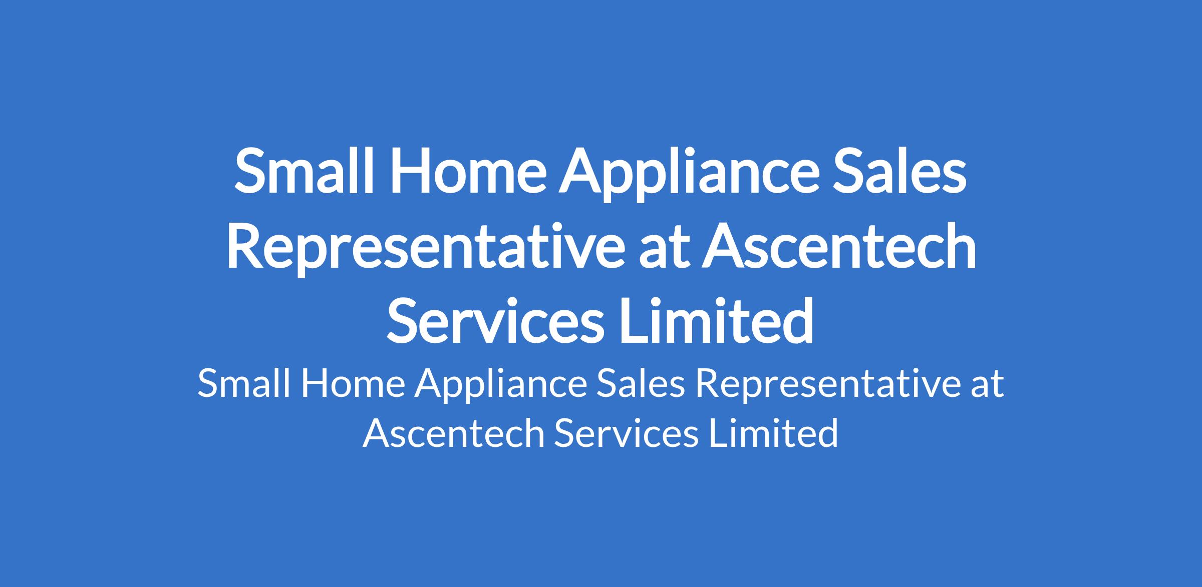 Ascentech Services Limited is recruiting to fill the position of: Small Home Appliance Sales Representative. The position is located in Ibadan, Oyo State. Salary: N100,000 - N150,000 monthly. Interested candidates should possess an OND / HND / BSc in a relevant field with 13 years sales experience.