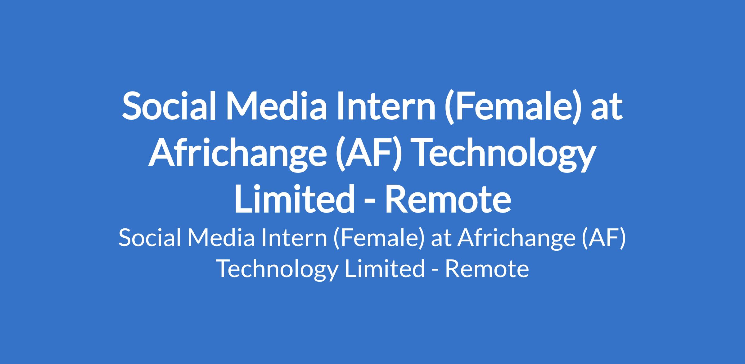 Africhange (AF) Technology Limited is recruiting to fill the position of: Social Media Intern (Female). This is a remote job. Interested candidates should be recent graduates or possess 0 - 2 years of experience in social media, digital marketing, or communications.