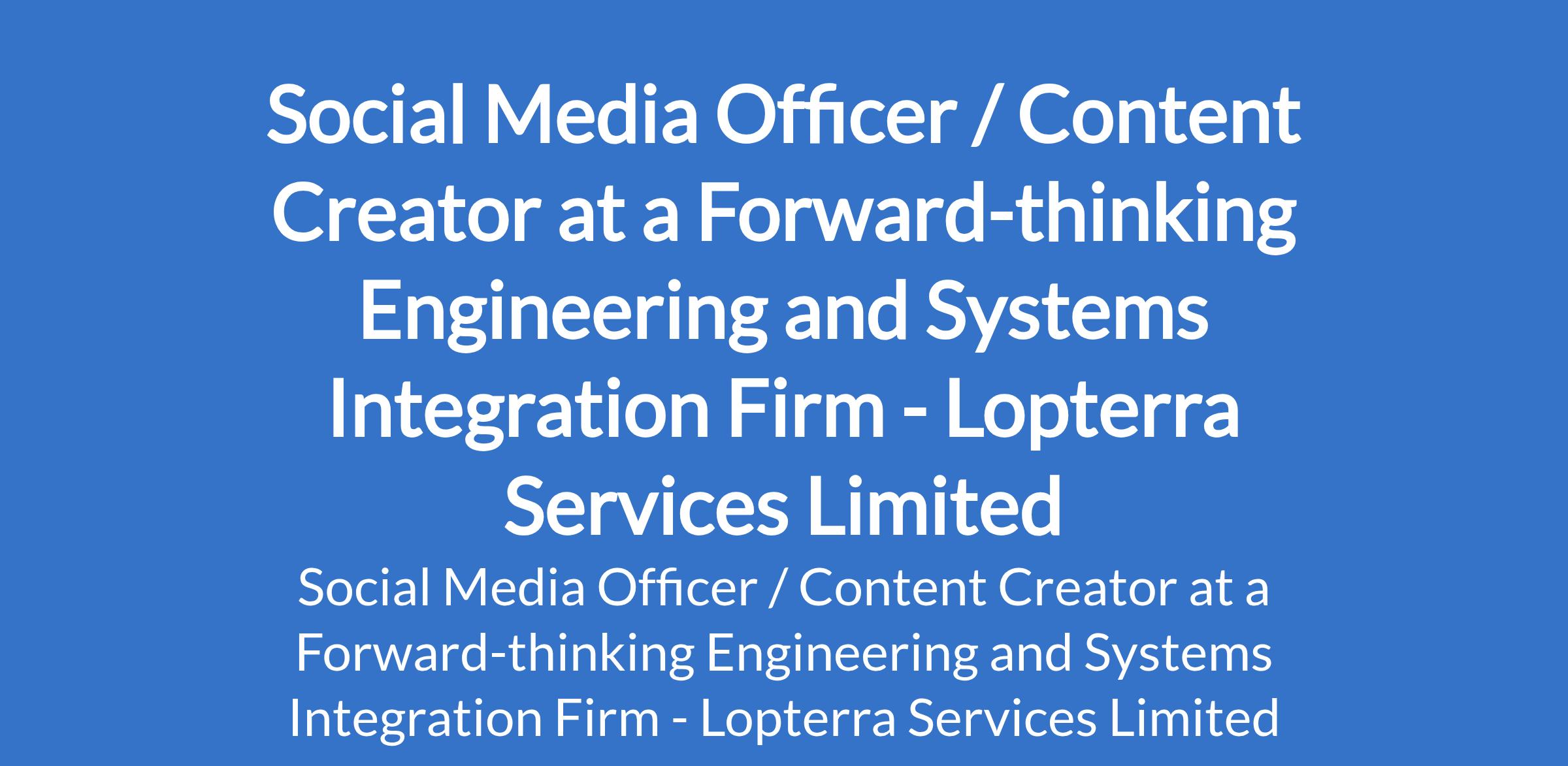 Lopterra Services Limited - Our client, a forward-thinking engineering and systems integration firm, is recruiting to fill the position of: Social Media Officer / Content Creator. The position is located in Ikeja, Lagos State. Salary: N120,000 - N150,000 monthly. Interested candidates should possess a Bachelors Degree in Marketing, Communications, Media, or a related field with 23 years of experience as a Social Media Manager or Content Creator.