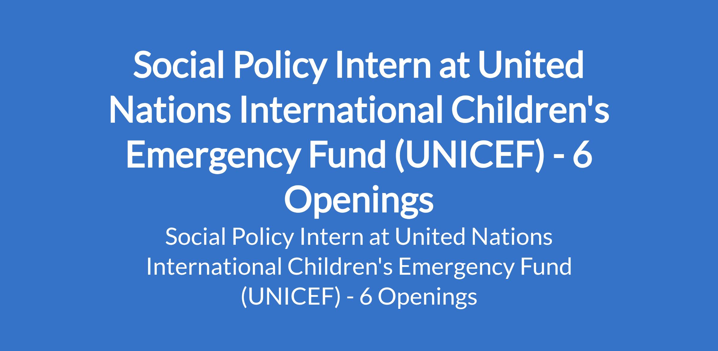 United Nations International Children's Emergency Fund (UNICEF) is recruiting to fill the position of: Social Policy Intern. The position is located in Abuja, Kano, Bauchi, Enugu, Lagos, and Sokoto States. Interested candidates should be current Nigerian students at the 200 level or above of a First University Degree programme in Social Sciences, Administration, Public Policy, or a related field.