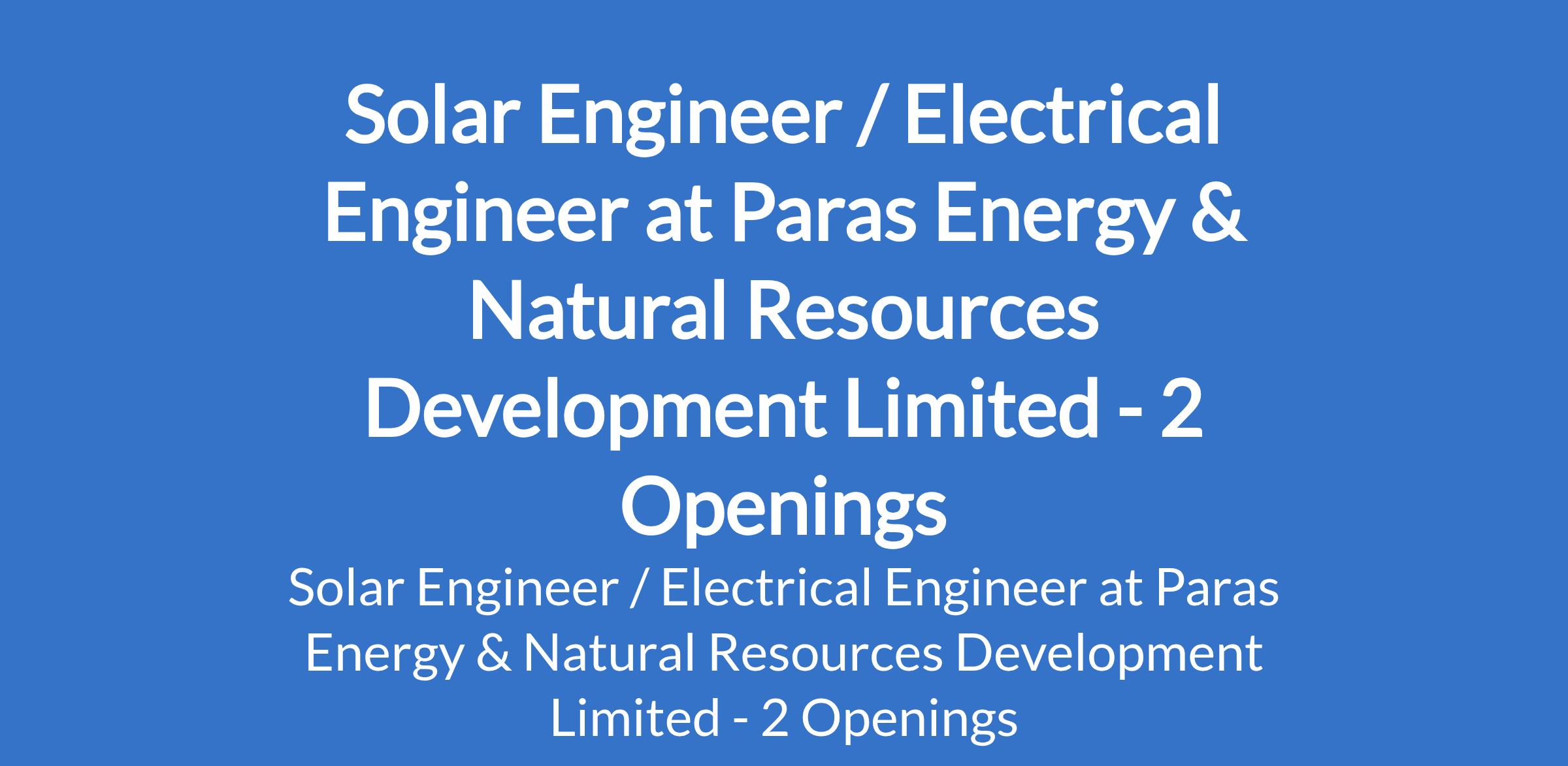 Paras Energy & Natural Resources Development Limited is recruiting to fill the position of: Solar Engineer / Electrical Engineer. The position is located in Agbara - Ogun and Ikeja - Lagos States. Interested candidates should possess a Bachelors Degree in Electrical / Mechanical / Renewable Energy Engineering or related fields with 25 years of experience in solar PV design, installation, or maintenance.