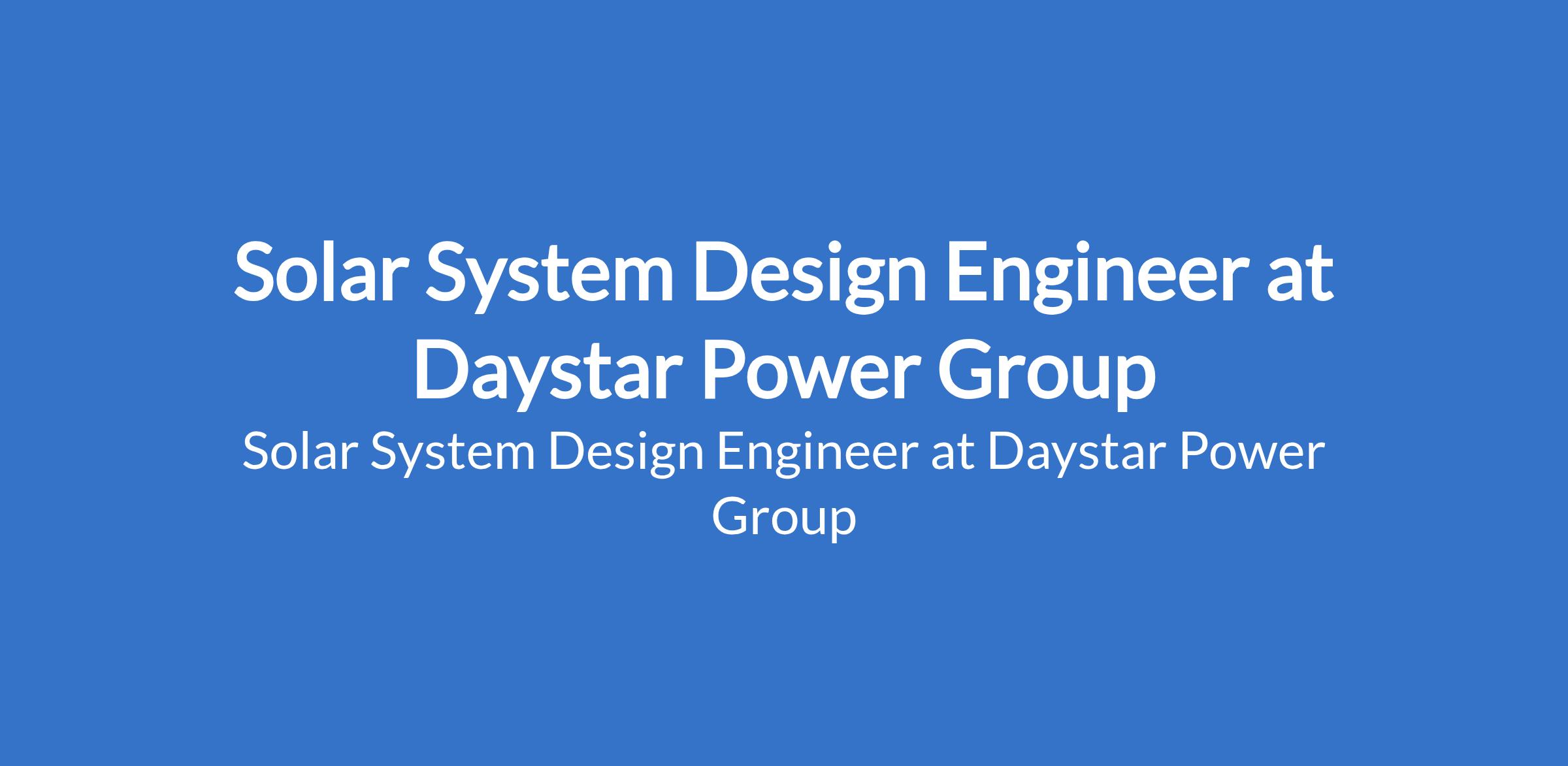 Daystar Power Group is recruiting to fill the position of: Solar System Design Engineer. The position is located in Lagos State. Interested candidates should possess minimum of a Bachelors Degree in Electrical Engineering with a minimum of 3 years work experience in Electrical Engineering roles, preferably in the renewable energy or power industry, installing and / or maintaining solar systems.