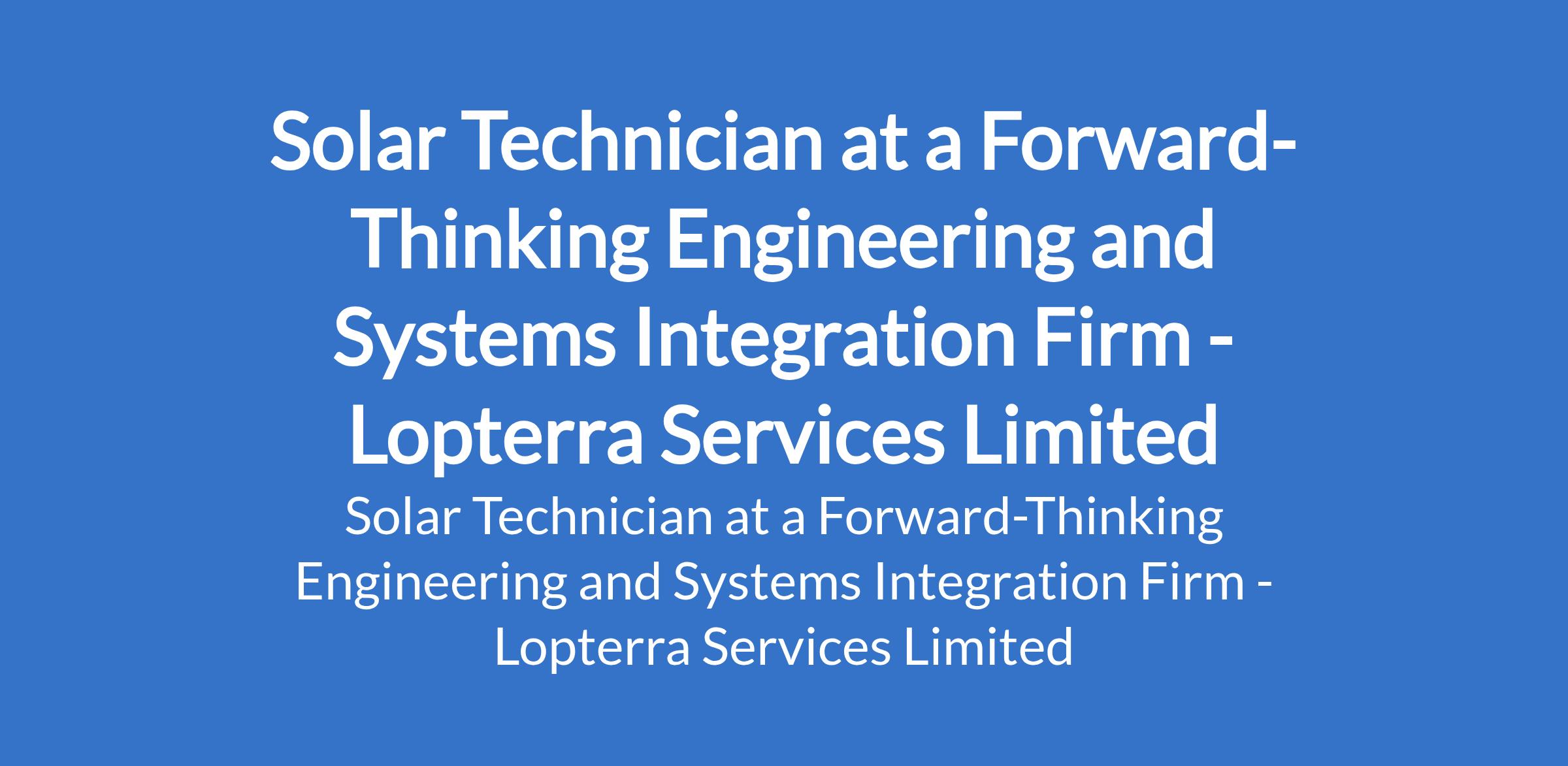 Lopterra Services Limited - Our client, a forward-thinking Engineering and Systems Integration firm is recruiting to fill the position of: Solar Technician. The position is located in Ikeja, Lagos State. Interested candidates should possess an OND in Electrical Engineering or a Technical Certificate from Recognised Technical Institutes with 2 years experience in designing and implementing electrical and solar power systems.