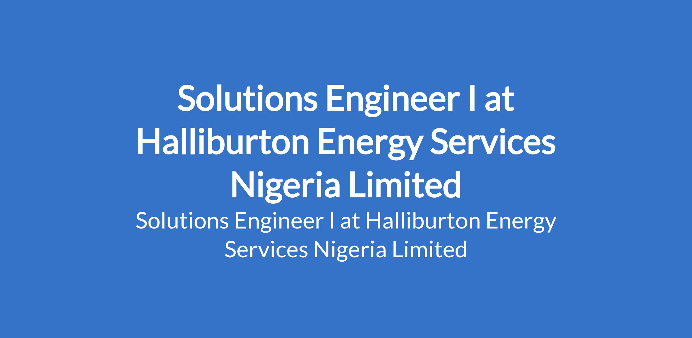 Halliburton Energy Services Nigeria Limited is recruiting to fill the position of: Solutions Engineer I. The position is located in Lagos State. Interested candidates should possess an undergraduate Degree in an Engineering, Computer Science, or similar disciplines (discipline may vary by domain) and a minimum of 2 years experience in the energy software industry or equivalent.