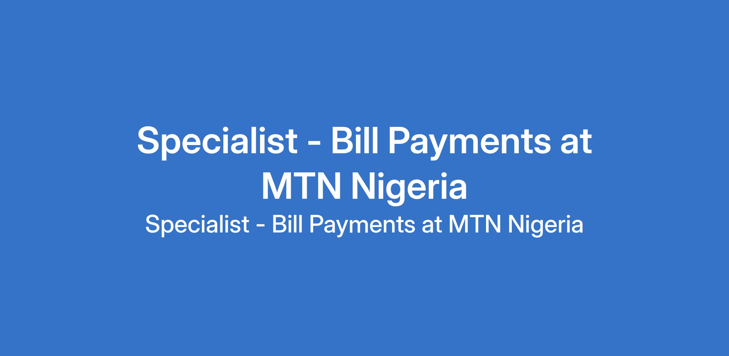 MTN Nigeria is recruiting to fill the position of: Specialist - Bill Payments. The position is located in Victoria Island, Lagos State. Interested candidates should possess a First Degree in Computer Science, Engineering, or related field with 3 - 7 years of experience in Fintech Payments, Ecommerce or Telecommunication industry.