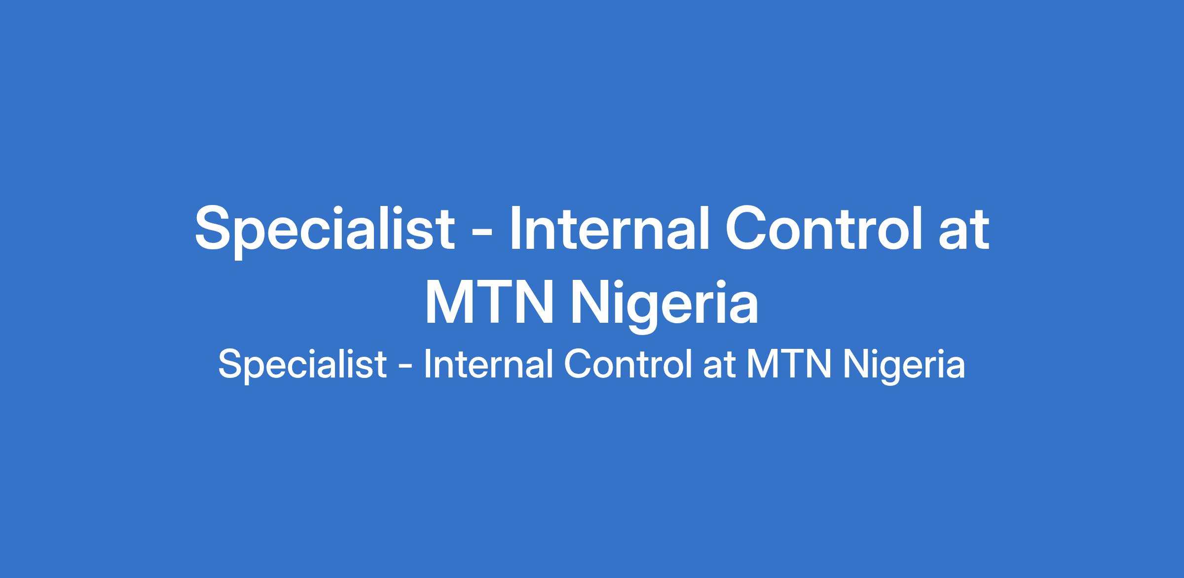 MTN Nigeria is recruiting to fill the position of: Specialist - Internal Control. The position is located in Victoria Island, Lagos State. Interested candidates should possess a Degree in Business Administration / Management, Finance, Accounting, Business Science with 37 years experience in Internal Control, E-Business or related field.