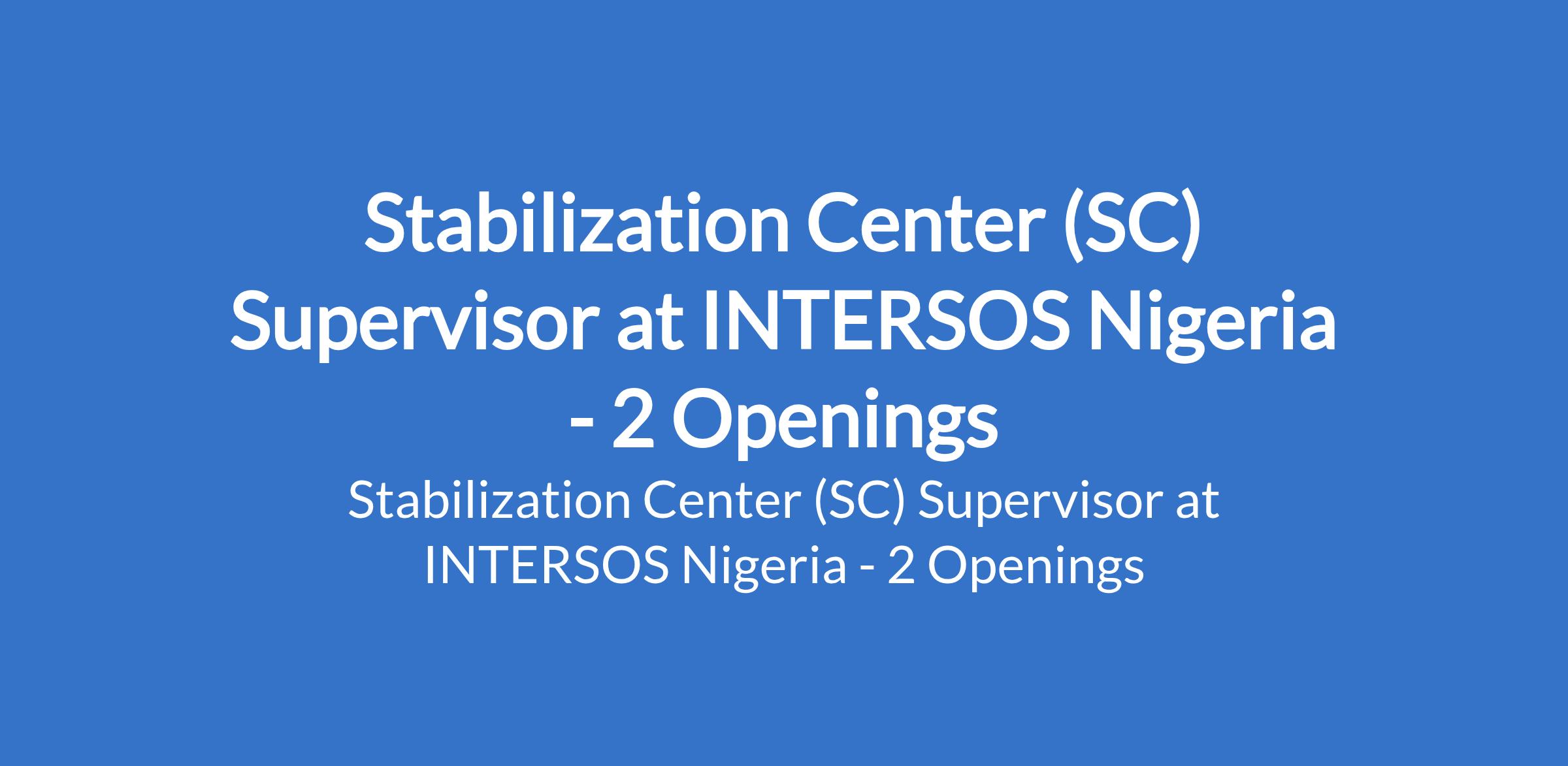 INTERSOS Nigeria is recruiting to fill the position of: Stabilization Center (SC) Supervisor. The position is located in Dikwa and Magumeri, Borno State. Interested candidates should possess a Bachelors Degree in Medicine (MB.BS / MBChB) with experience in emergency nutrition response especially in complicated SAM management at Stabilization centre level and clinical experience in management of children under five at the in-patient level with over (3) years experience in complicated SAM case management in SC and CMAM programmes.