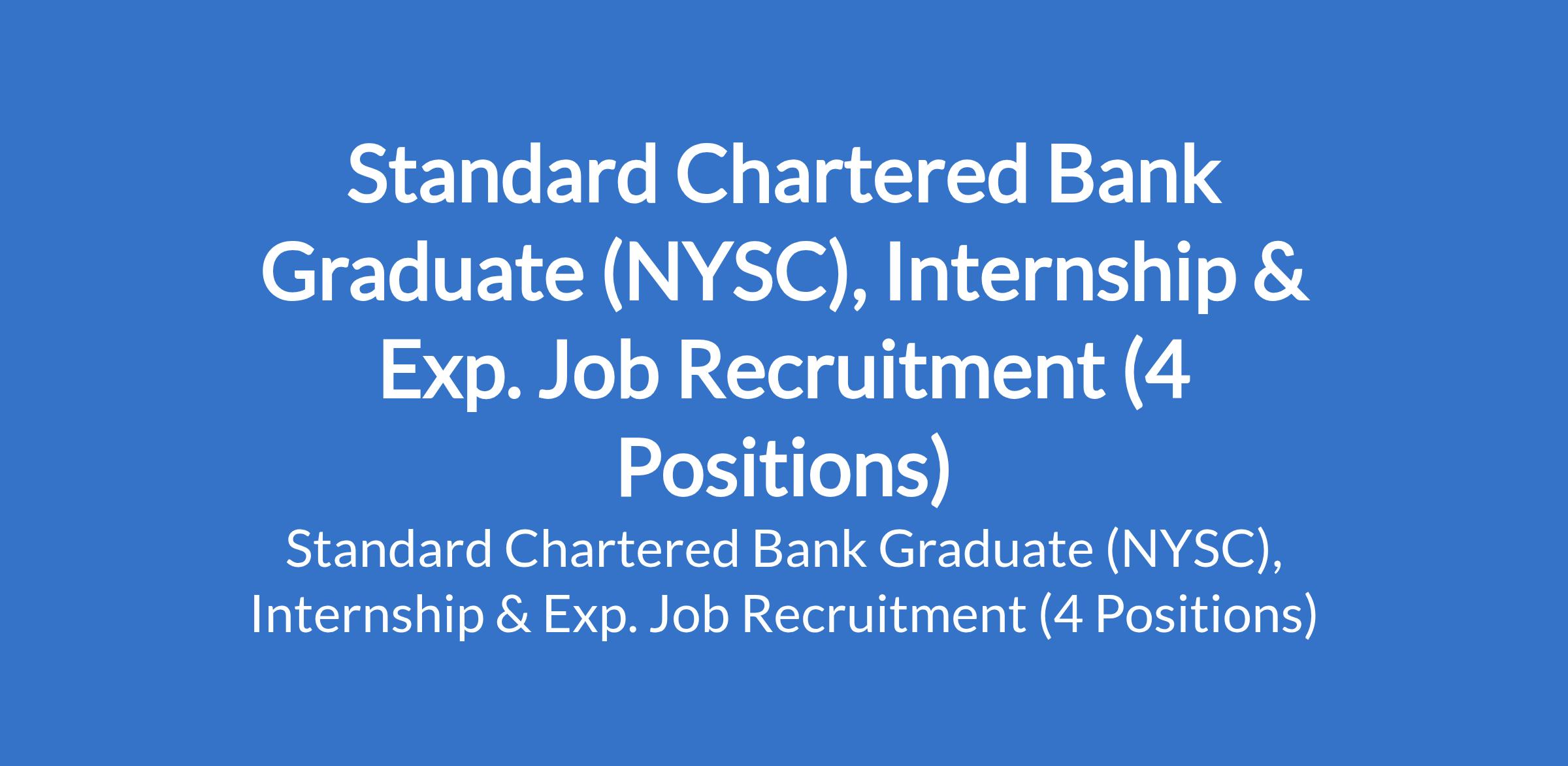 Standard Chartered Bank is recruiting to fill the following graduate, internship, and experienced positions in Abuja and Lagos State: National Youth Service Corps Member (Markets), Senior Relationship Manager, Standard Chartered Bank Treasury Internship Programme 2026, and Standard Chartered Bank Client Coverage Internship Programme 2026.