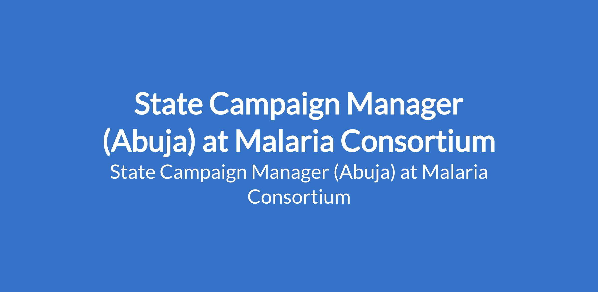 Malaria Consortium is recruiting to fill the position of: State Campaign Manager. The position is located in Abuja. Interested candidates should possess a Bachelors Degree or higher in Health or Social Sciences field with a minimum of 7 years experience in related/similar role.
