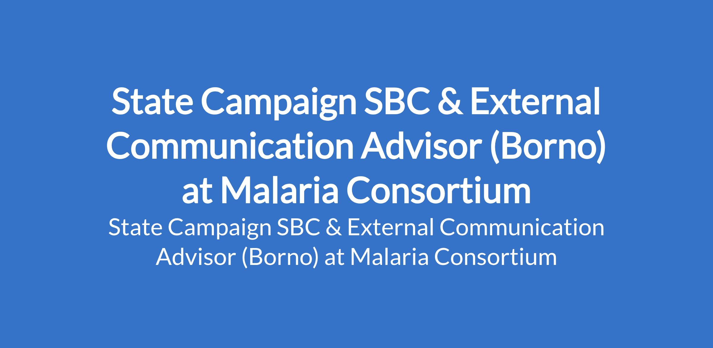 Malaria Consortium is recruiting to fill the position of: State Campaign SBC & External Communication Advisor. The position is located in Borno State. Interested candidates should possess a Master's Degree and / or significant work experience with emphasis on public health strategic communication, public relations or media, in context of Nigeria / Africa, and with some marketing communication experience.
