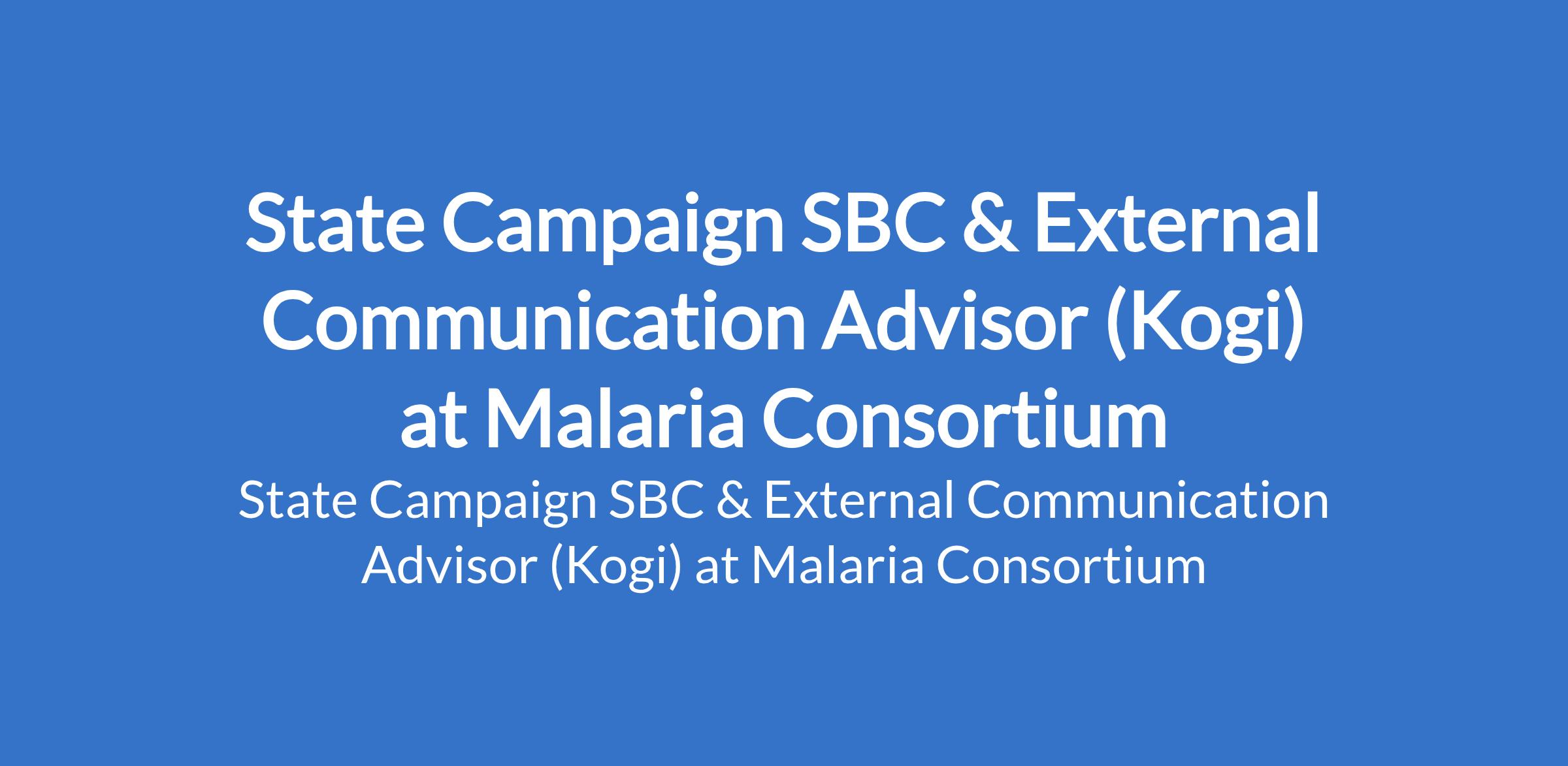 Malaria Consortium is recruiting to fill the position of: State Campaign SBC & External Communication Advisor. The position is located in Kogi State. Interested candidates should possess a Master's Degree and / or significant work experience with emphasis on public health strategic communication, public relations or media, in context of Nigeria / Africa, and with some marketing communication experience.