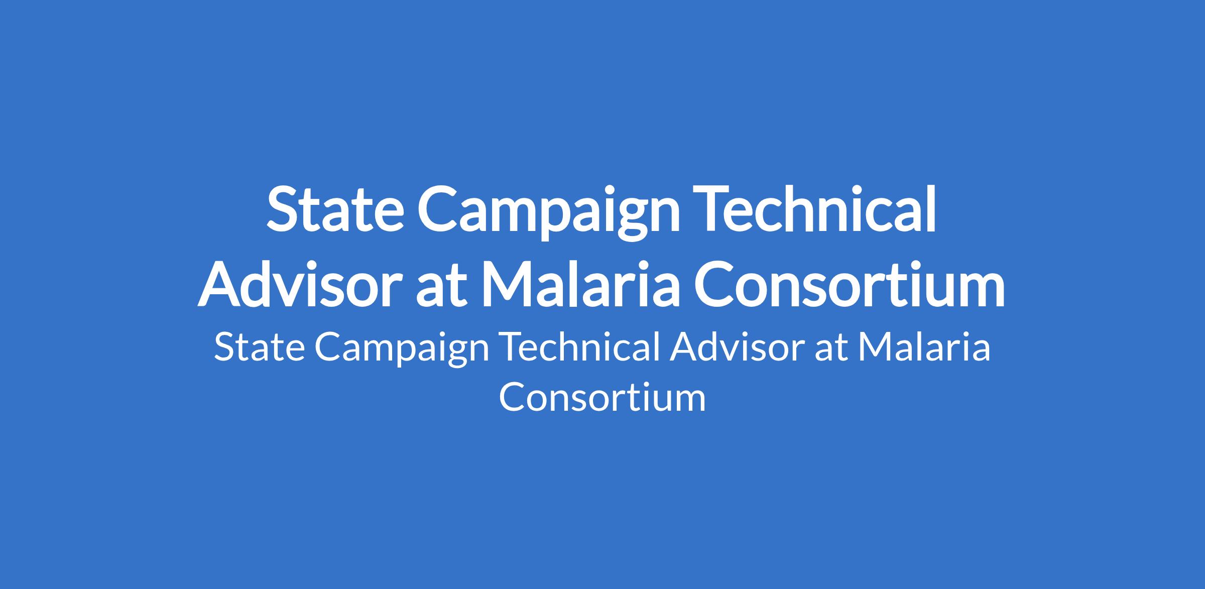 Malaria Consortium is recruiting to fill the position of: State Campaign Technical Advisor. The position is located in Abia State. Interested candidates should possess a Masters Degree in Public Health, Epidemiology, Biostatistics, Statistics or a related research discipline with strong experience in a research-focused role with an excellent understanding of quantitative research methods.