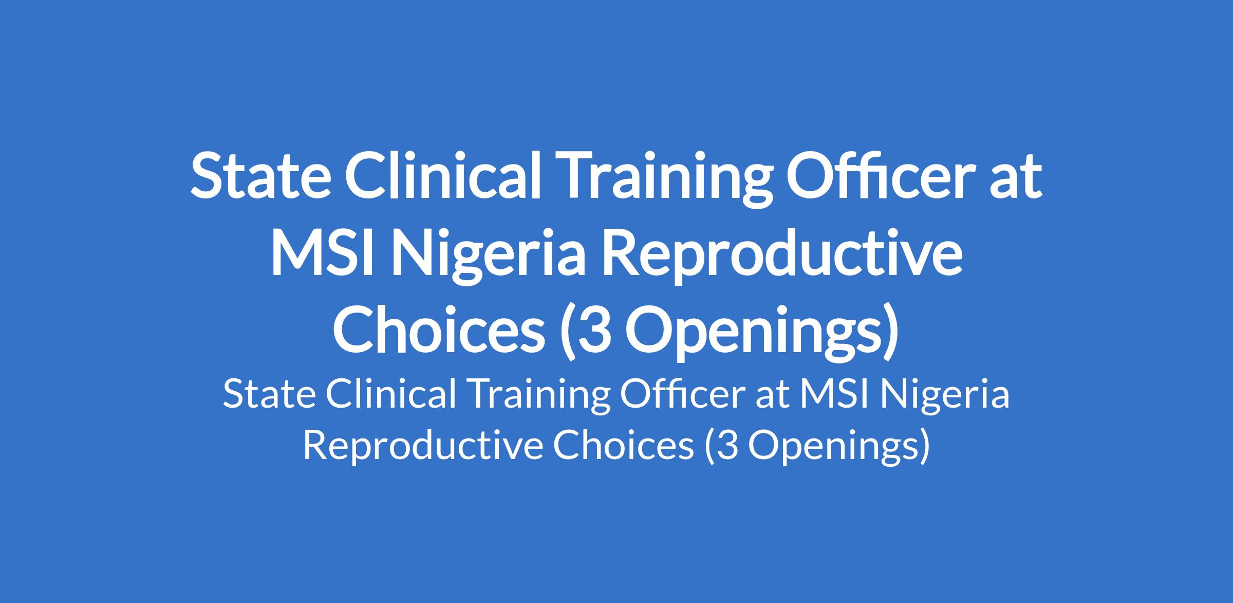 MSI Nigeria Reproductive Choices is recruiting to fill the position of: State Clinical Training Officer. The position is located in Sokoto State. Interested candidates should be a Medical Doctor, Registered Nurse or Midwife or other related areas in Medical Sciences with experience.