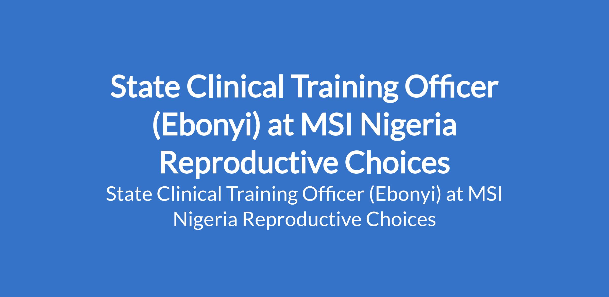 MSI Nigeria Reproductive Choices is recruiting to fill the position of: State Clinical Training Officer. The position is located in Ebonyi State. Interested candidates should be a Medical Doctor, Registered Nurse or Midwife or other related areas in Medical Sciences with 5-8 years experience.