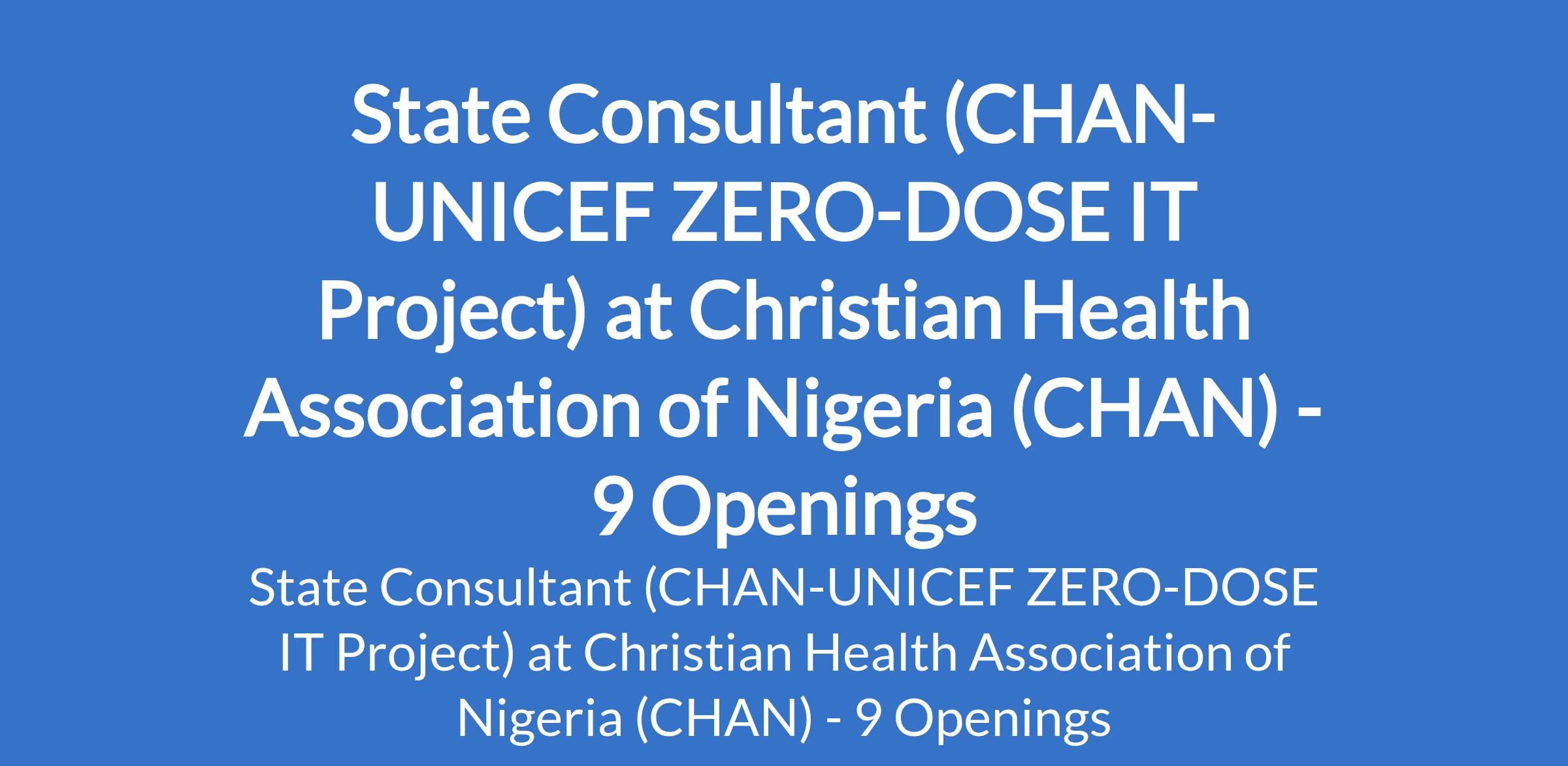 Christian Health Association of Nigeria (CHAN) is recruiting to fill the position of: State Consultant (CHAN-UNICEF ZERO-DOSE IT Project). The position is located in Abuja, Adamawa, Bauchi, Bayelsa, Kebbi, Lagos, Niger, Ogun and Ondo States. Interested candidates should possess a Bachelors Degree in Medicine, Nursing, Public Health, or Social Sciences with a minimum of 5 (five) years of professional work experience in a complex NGO environment, preferably managing major public health projects and initiatives, preferably in child health programming and immunization, SIAs, and zero-dose programming.
