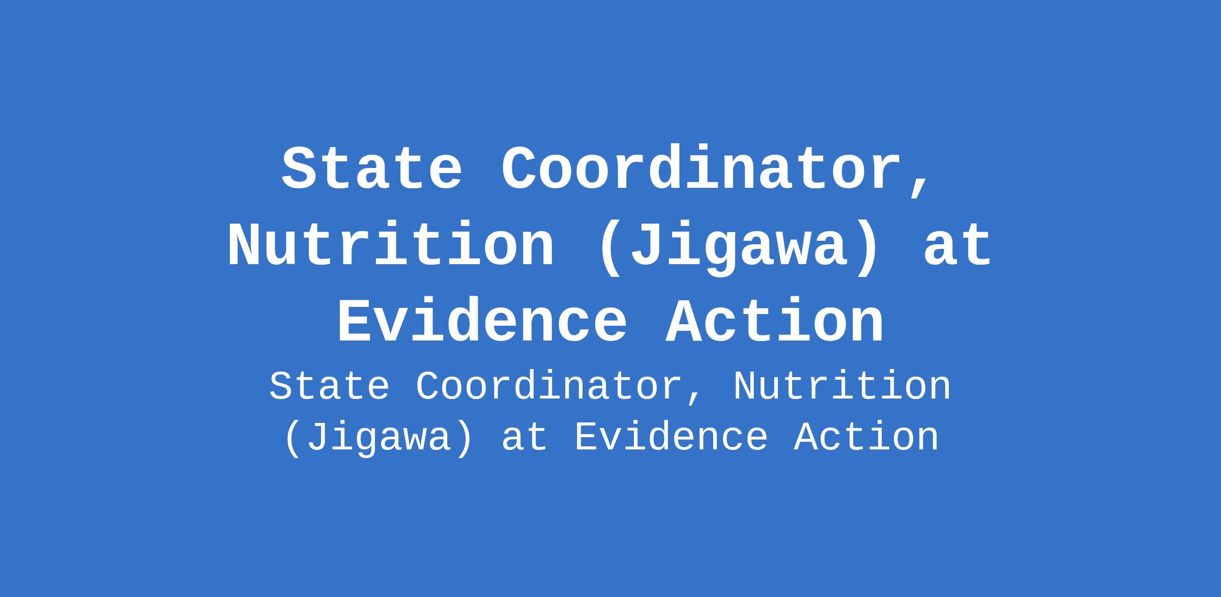 Evidence Action is recruiting to fill the position of: State Coordinator, Nutrition. The position is located in Jigawa State. Interested candidates should possess a Bachelor's Degree in Public Health, Nutrition, Medicine, Nursing, Pharmacy, Health Sciences, Social Sciences, Development Studies, or a related field; Masters degree in Public Health, Nutrition, Health Systems, Development Studies, or a related discipline with 5years of experience in nutrition, public health, or child health programming, preferably with government or NGOs in Nigeria.