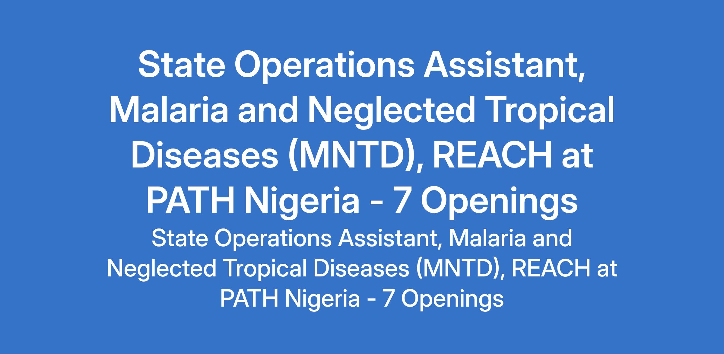 PATH Nigeria is recruiting to fill the position of: State Operations Assistant, Malaria and Neglected Tropical Diseases (MNTD), REACH. The position is located in Ebonyi, Kebbi, Akwa Ibom, Plateau, Oyo, Cross River and Benue States. Interested candidates should possess a Degree in Accounting, Management, Business Administration, or related field with at least 3 years of experience.