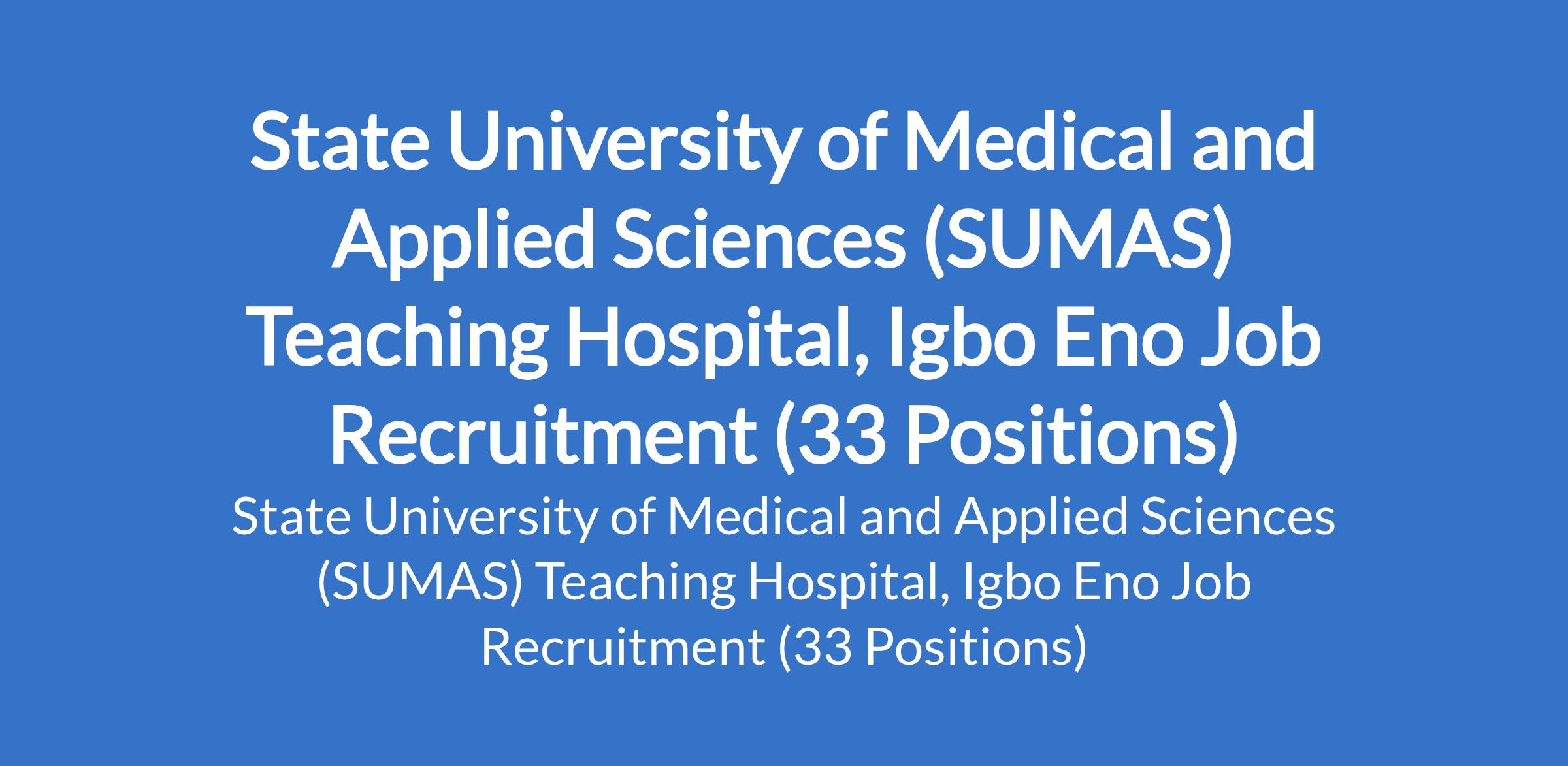 State University of Medical and Applied Sciences (SUMAS) Teaching Hospital, Igbo Eno is recruiting suitably qualified candidates to fill the following positions in Enugu State: Consultants Optician, Dental Technician, Central Sterile Supply Department (CSSD), Laboratory Technician, Orthopaedic Technician, Pharmacy Technician, Electrocardiogram (ECG) Technician, Radiographer, Driver and Orderlies.