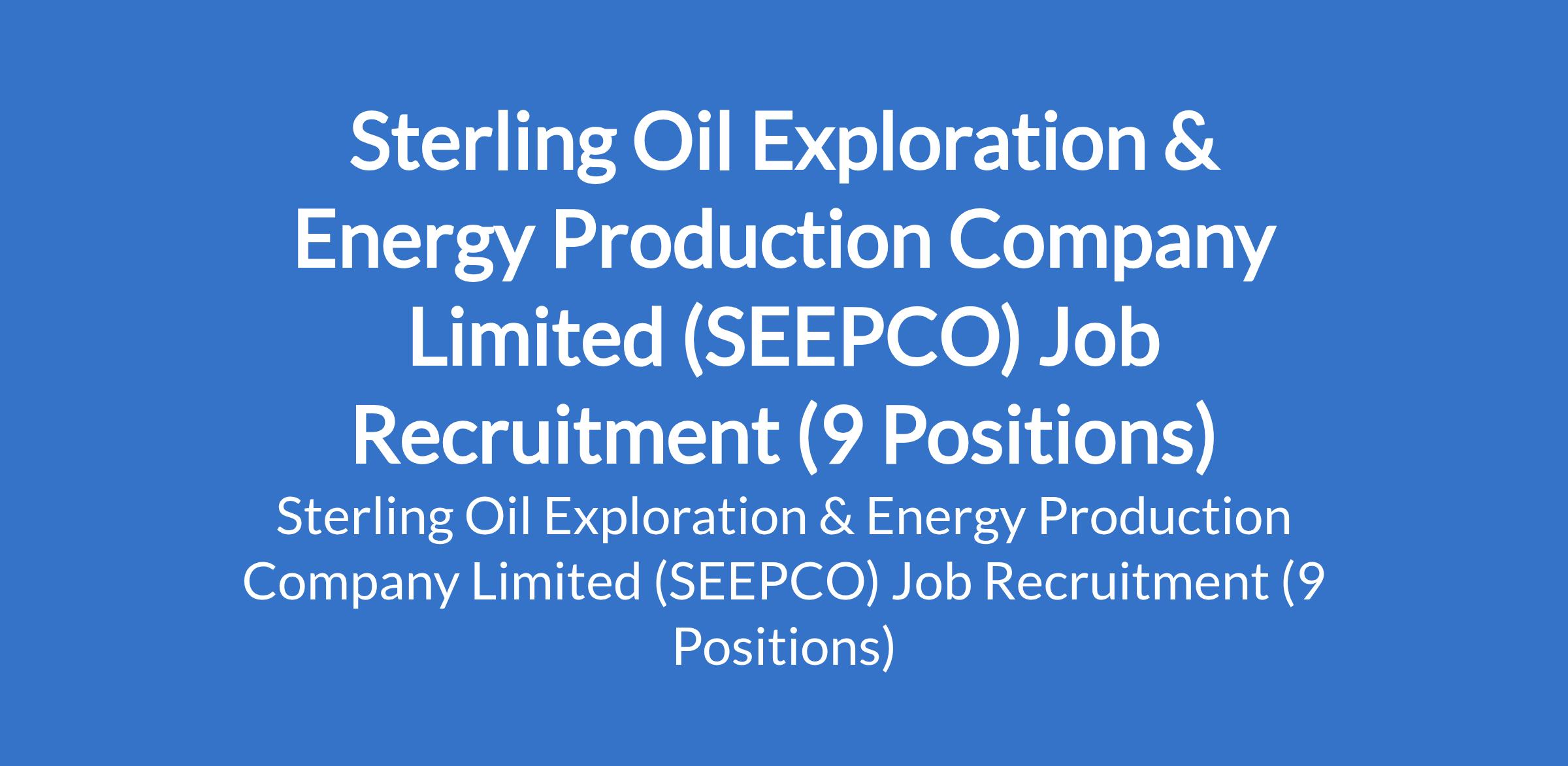 Sterling Oil Exploration & Energy Production Company Limited (SEEPCO) is recruiting suitably qualified candidates to fill the following positions in Lagos State: Legal Manager, Store In Charge Officer, Documentation & Logistics Officer, Electrician / Technician, Bottling Plant Officer, Packaging / Palletizing Supervisor, Operator Technician, Laboratory / Quality Control, and Operations Supervisor.