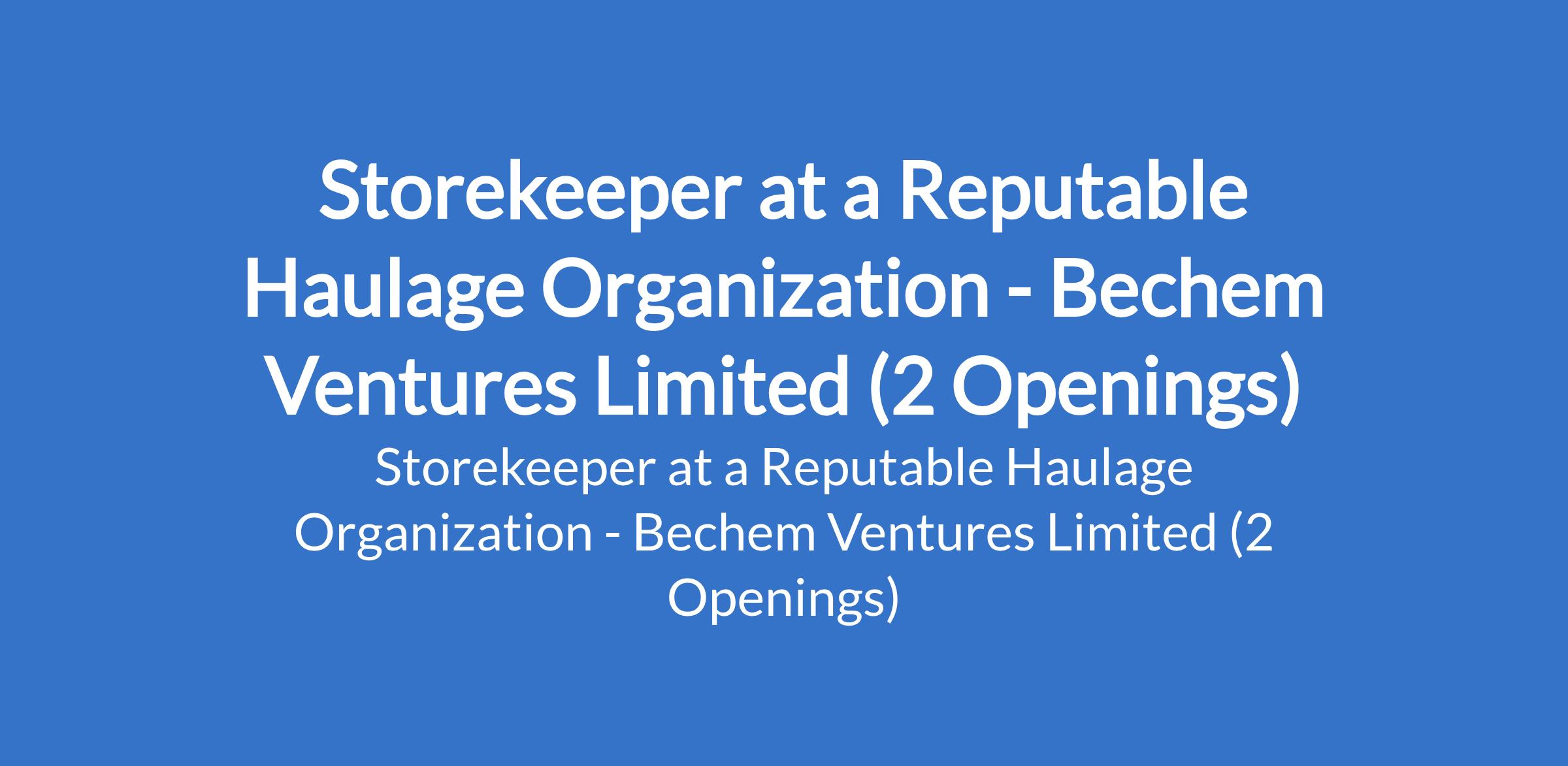 Bechem Ventures Limited - Our client, a reputable haulage organization, is recruiting to fill the position of: Storekeeper. The position is located in Calabar - Cross River & Lagos States. Salary: N150,000 - N500,000 monthly. Interested candidates should possess relevant qualifications.
