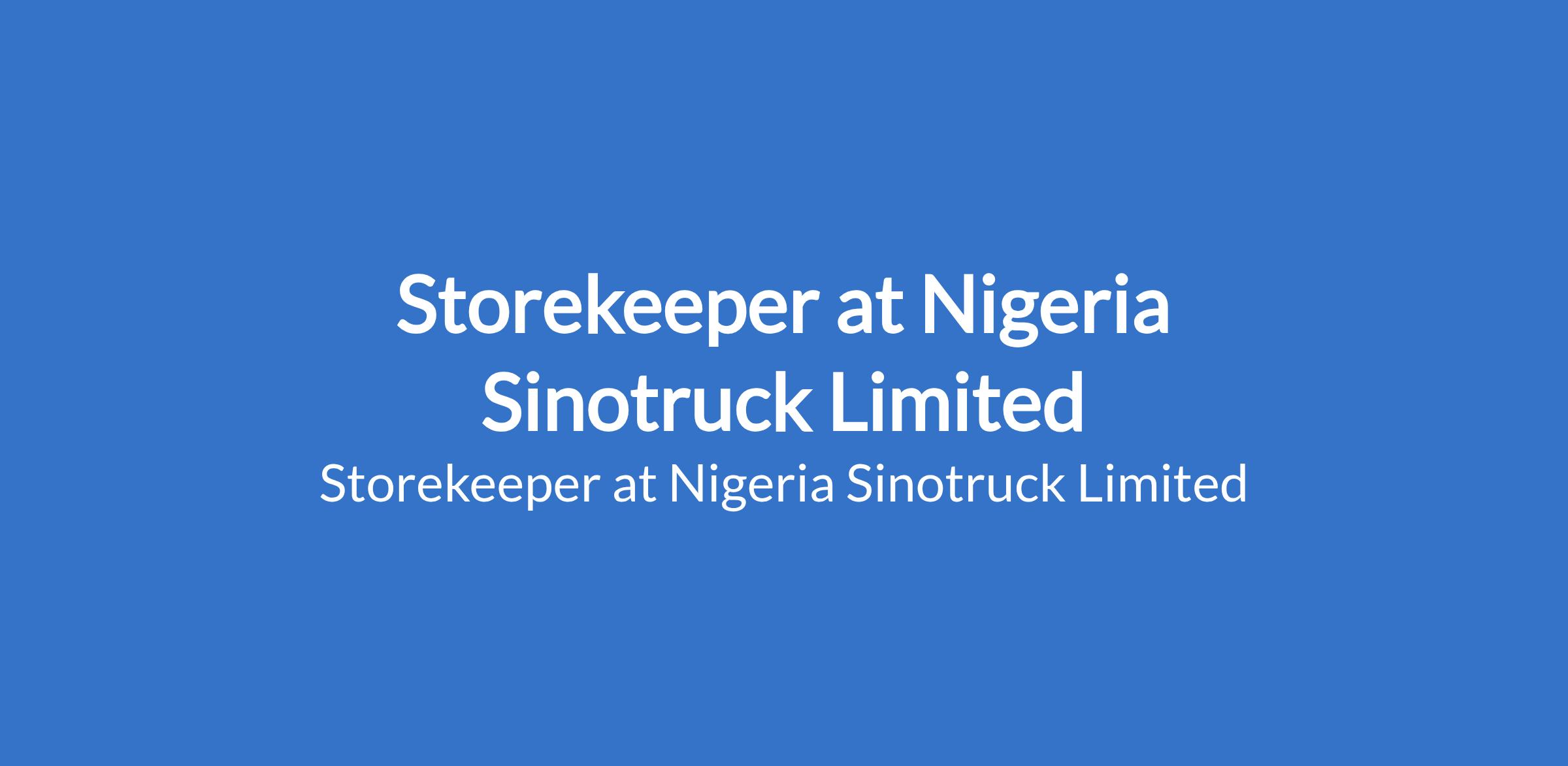 Nigeria Sinotruck Limited is recruiting to fill the position of: Storekeeper. The position is located in Benin, Edo State. Interested candidates should possess an OND qualification in Mechanical Engineering, Accounting, Store Management, Purchasing Management, Business Management or its equivalent with a minimum of 2 years work experience in Store Management or similar role.