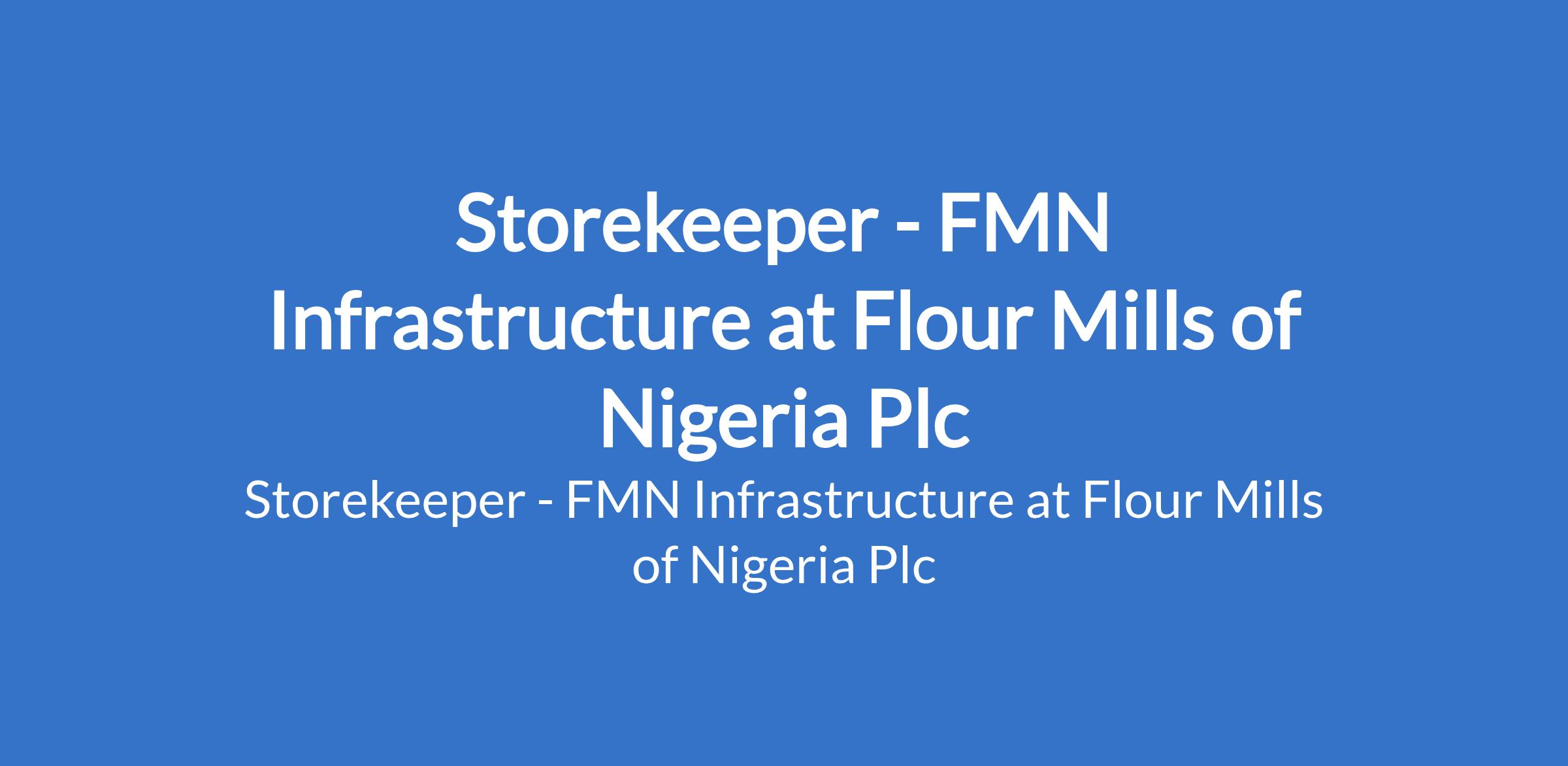 Flour Mills of Nigeria Plc is recruiting to fill the position of: Storekeeper - FMN Infrastructure. The position is located in Apapa, Lagos State. Interested candidates should possess minimum of 5 OLevel credits, including Mathematics and English Language with a minimum of 2 years cognate experience in a similar role.