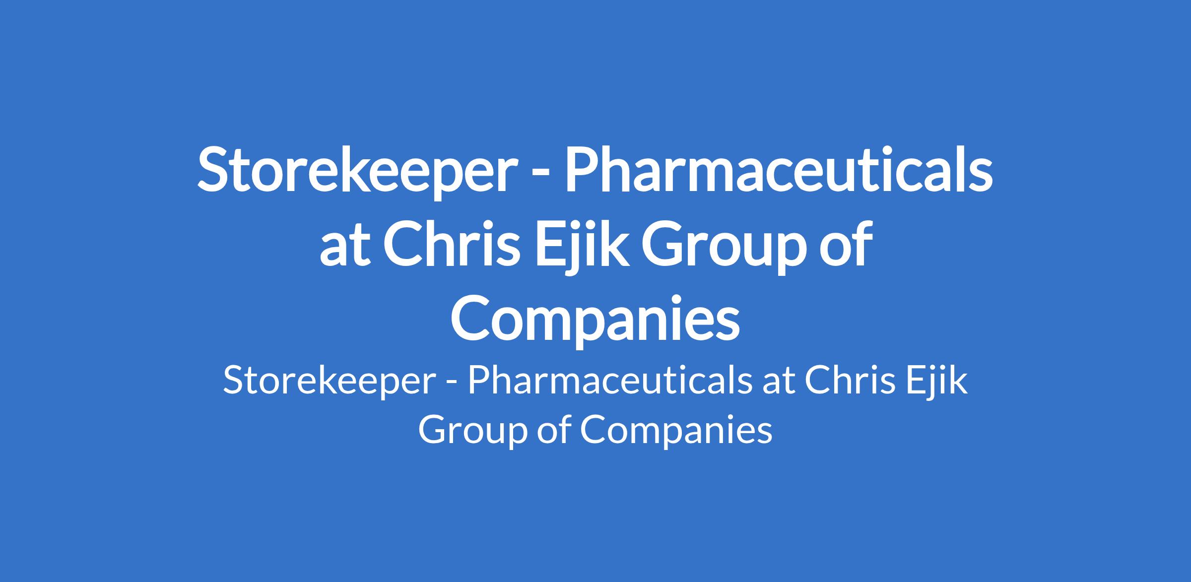 Chris Ejik Group of Companies is recruiting to fill the position of: Storekeeper - Pharmaceuticals. The position is located in Lagos State. Interested candidates should possess relevant qualifications.
