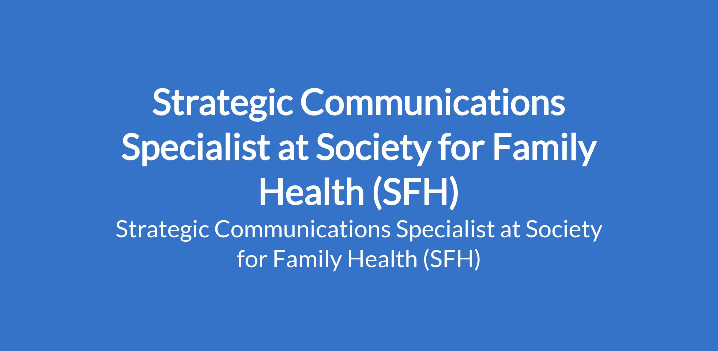 Society for Family Health (SFH) is recruiting to fill the position of: Strategic Communications Specialist. The position is located in Abuja. Interested candidates should possess a Bachelors Degree in Communications, Public Relations, Journalism, Marketing, or a related field with 710 years of relevant experience in strategic communications, brand positioning, or content strategy.