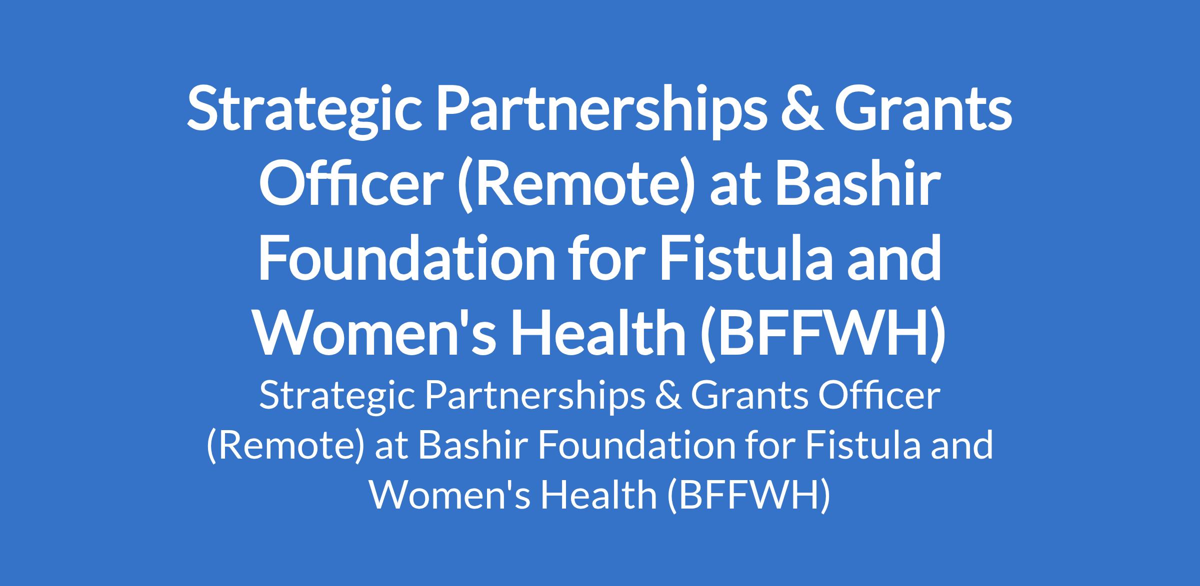 Bashir Foundation for Fistula and Women's Health (BFFWH) is recruiting to fill the position of: Strategic Partnerships & Grants Officer. Interested candidates should possess a Bachelors Degree in Marketing, Social Sciences, Public Health, Development Studies, Business Administration, or a related field with 3-5 years of experience in grant writing, partnership development, fundraising, or a related role within the non-profit sector.