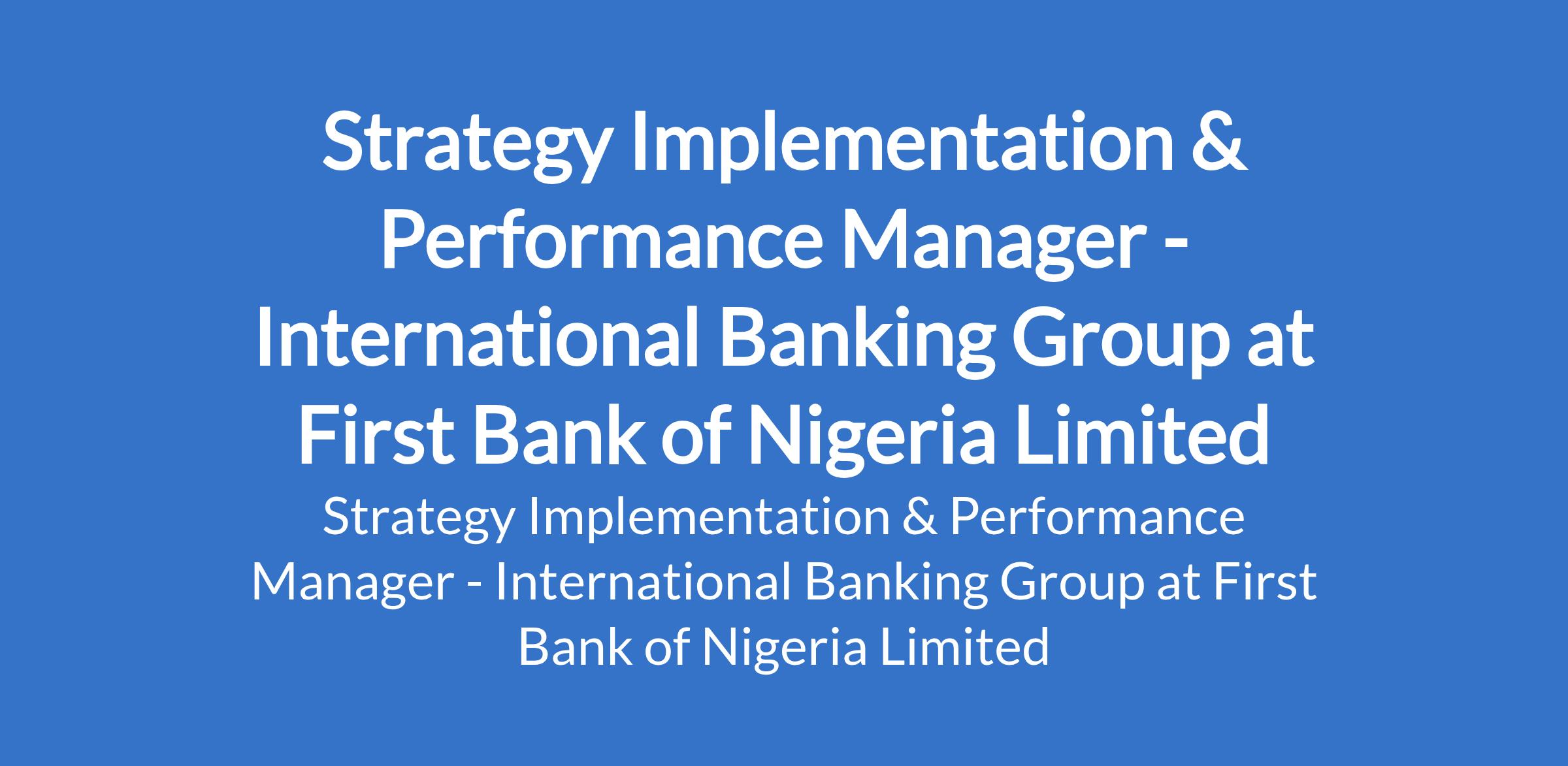 First Bank of Nigeria Limited is recruiting to fill the position of: Strategy Implementation & Performance Manager - International Banking Group. Interested candidates should possess a First Degree in any field (technical-based field is preferred - e.g., Economics, Engineering, Accounting, etc) with prior experience in business strategy and planning.