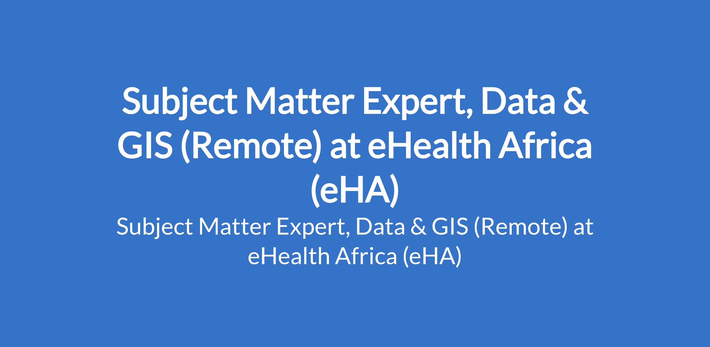 eHealth Africa (eHA) is recruiting to fill the position of: Subject Matter Expert, Data & GIS. This is a Remote job. Interested candidates should possess a Masters Degree in GIS, Geography, Data Science, Epidemiology, Public Health, Statistics, Computer Science, or a related field with a minimum of 8+ years of progressive experience in data management, GIS, spatial analysis, or health informatics, with at least 3 years in a business development, proposal writing, or technical advisory role.