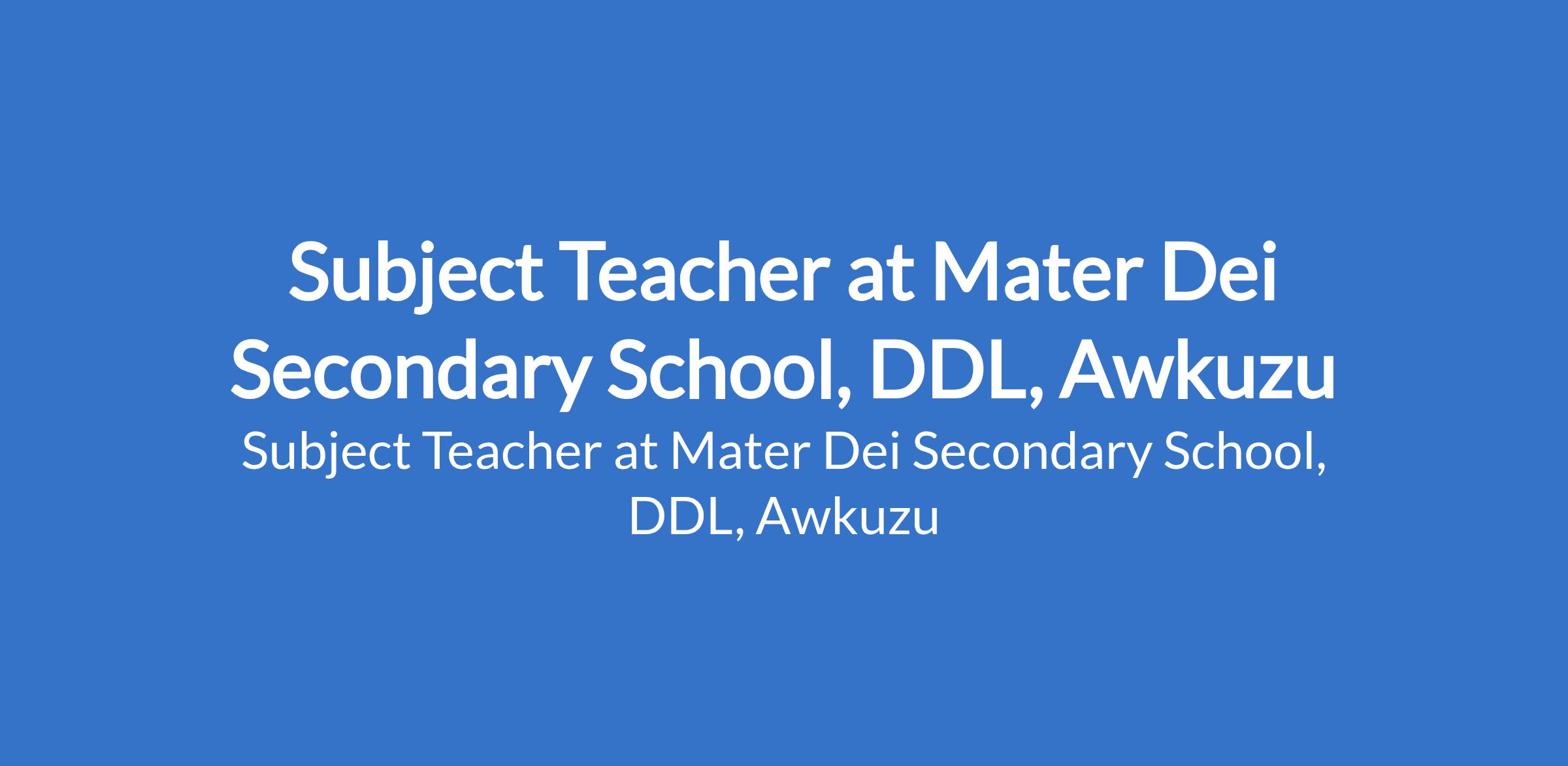 Mater Dei Secondary School, DDL, Awkuzu is recruiting to fill the position of: Subject Teacher. The position is located in Awkuzu, Anambra State. Interested candidates should possess a B.Sc, HND in a required field of application and should reside within Anambra and also willing to relocate and live within the school.