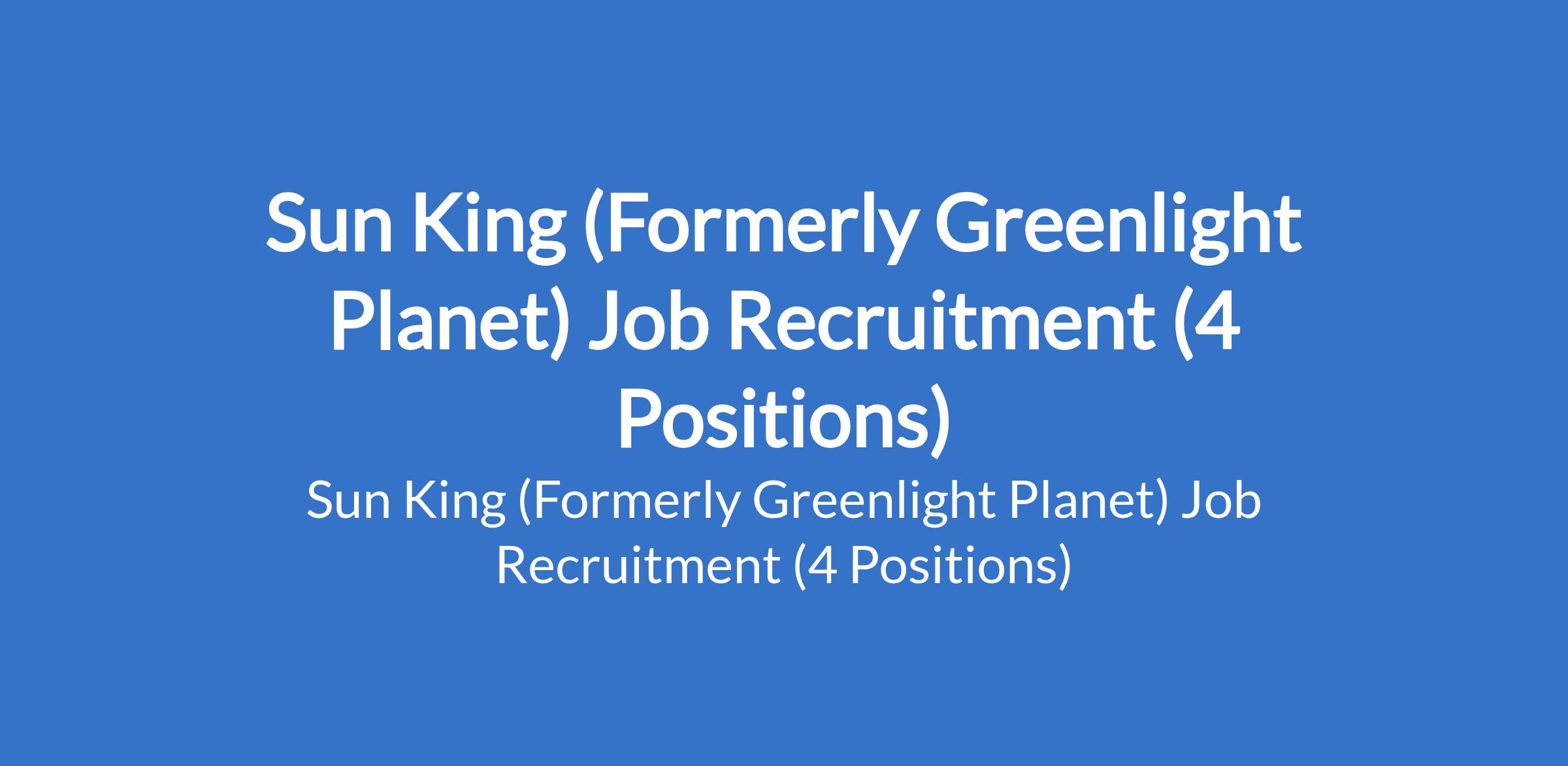 Sun King (Formerly Greenlight Planet) is recruiting suitable candidates to fill the following positions in Lagos, Ogun and Anambra States: Associate Regional Business Manager, South West; Regional Mentor, South East (Reliever); Phone Credit Manager; and Area Collections Executive.