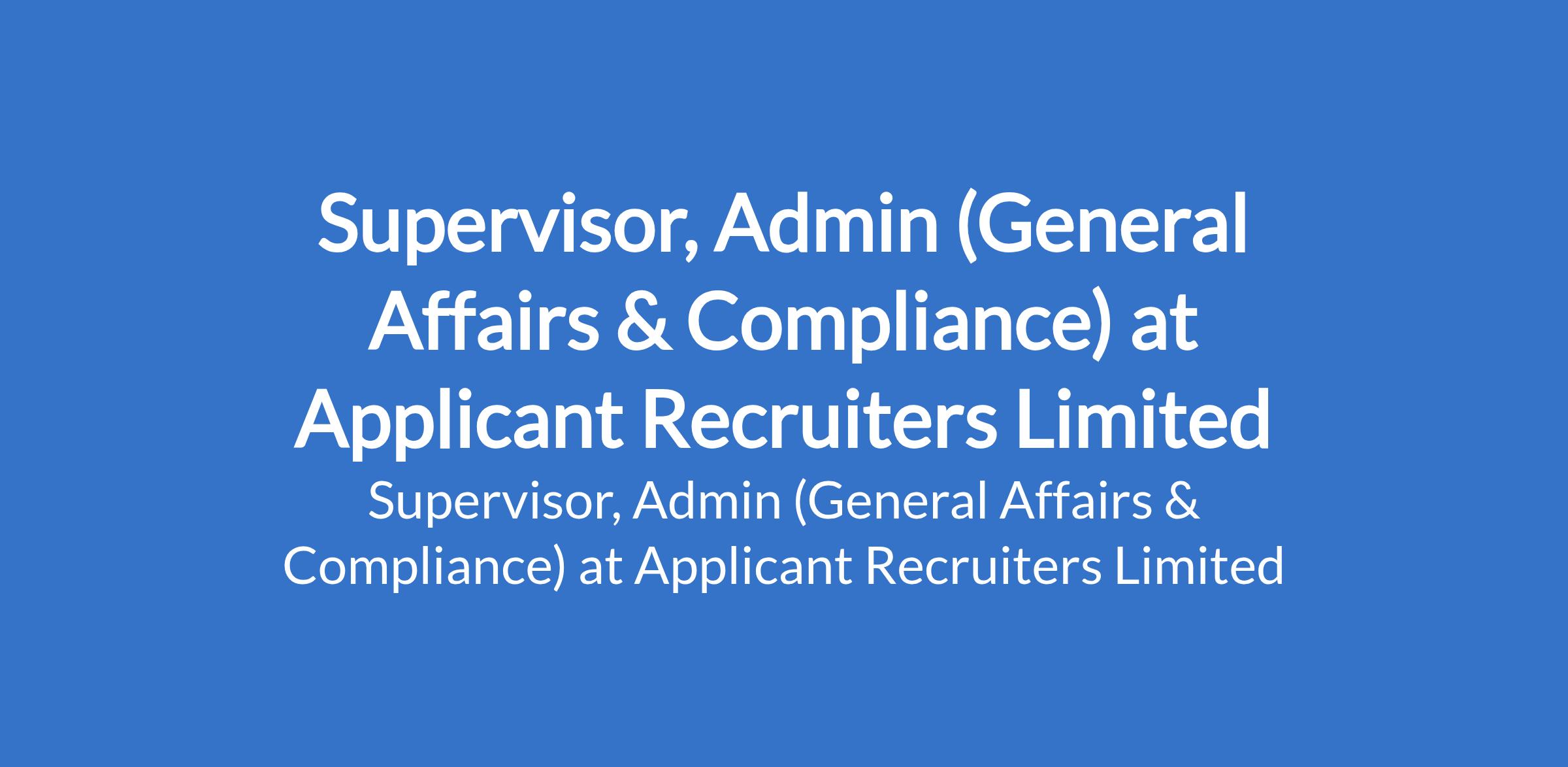 Applicant Recruiters Ltd is recruiting to fill the position of: Supervisor, Admin (General Affairs & Compliance). The position is located in Ikeja, Lagos State. Interested candidates should possess a Bachelor's Degree in Business Administration, Public Administration, or any related field in the FMCG sector with 5 years of experience in handling General Affairs Operation Factory.