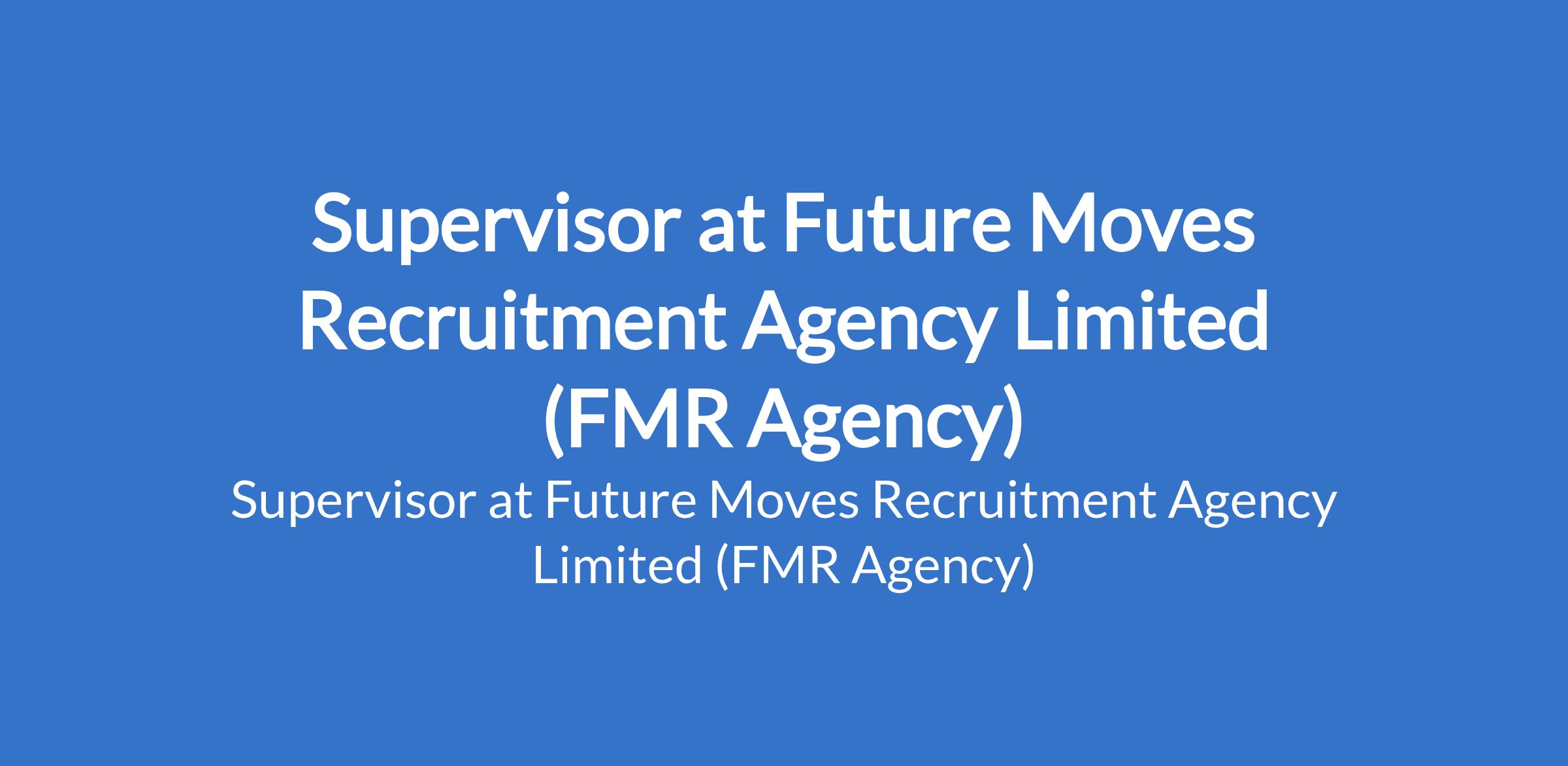 Future Moves Recruitment Agency Limited (FMR Agency) is recruiting to fill the position of: Supervisor. The position is located in Enugu Ukwu / Awka, Anambra State. Salary: N100,000 monthly. Interested candidates should possess minimum of an OND / HND / Bachelors Degree in any relevant field with 1 - 3 years experience in a supervisory or similar role.