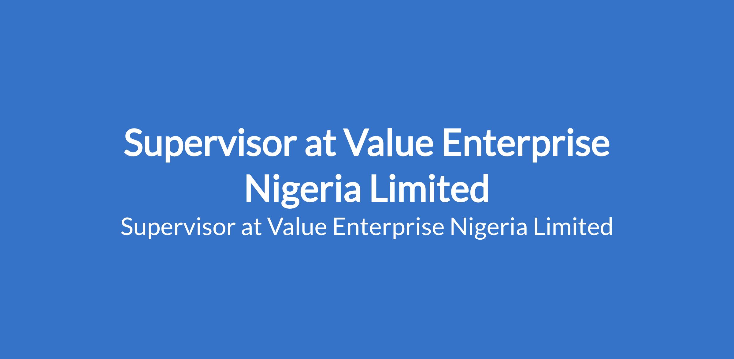 Value Enterprise Nigeria Limited is recruiting to fill the position of: Supervisor. The position is located in Abule-Egba, Lagos State. Salary: N110,000 - N140,000 / month. Interested candidates should possess an OND / HND / B.Sc. in any field with 25 years proven experience as a Supervisor in a supermarket, retail, fast-food, or hospitality environment, must be able to work mornings, evenings, weekends, and holidays and must live within or close to Abule-Egba / Agege / Iyana-Ipaja / Alimosho / Alakuko.