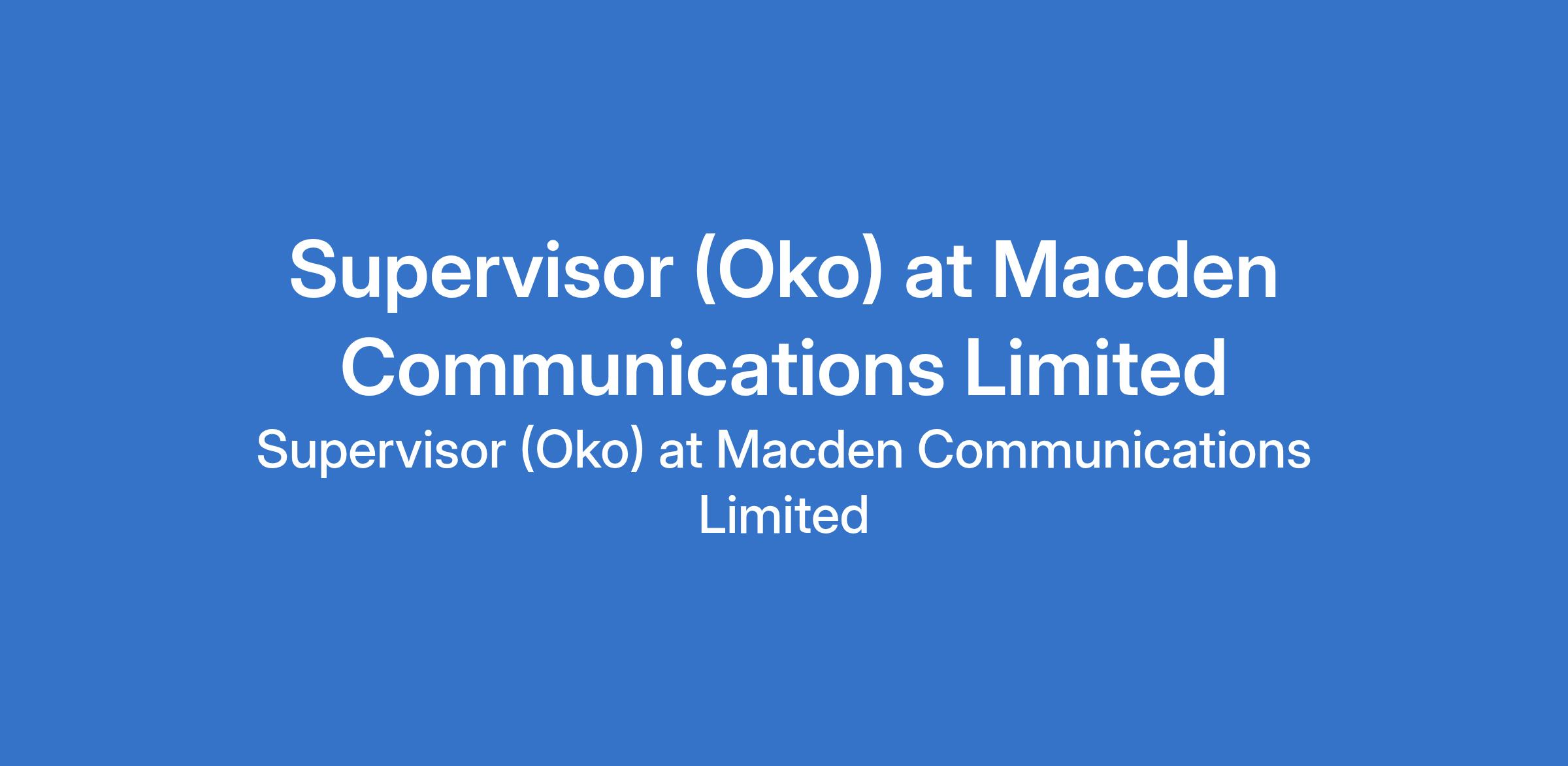 Macden Communications Limited is recruiting to fill the position of: Supervisor. The position is located in Oko, Anambra State. Salary: N95,000 - N100,000 monthly. Interested candidates should possess an OND, HND, or Bachelor's Degree with 3-5 years experience and must be resident around oko local govt area of Anambra state.