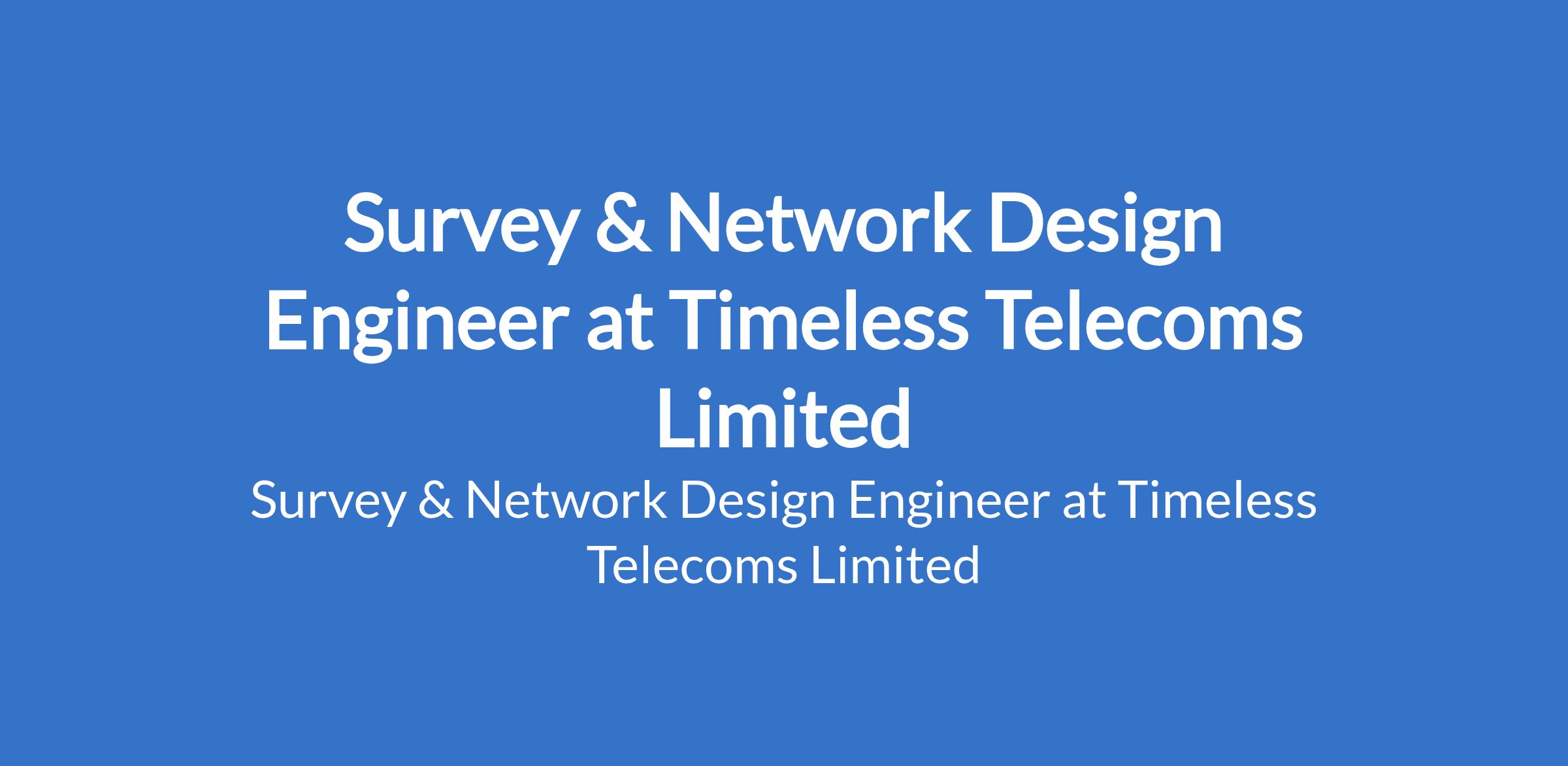 Timeless Telecoms Limited is recruiting to fill the position of: Survey & Network Design Engineer. The position is located in Ikeja, Lagos State. Salary: N300,000 - N400,000 per month. Interested candidates should possess a B.Sc Degree in Electrical Engineering, Computer Science, or related fields with 3+ years of experience in network design and implementation.